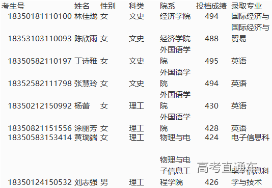 在福建本科二批次招收理科学生5人,录取最低分417分,录取最高分451分,录取最低分超过福建省本科二批次理科省控线39分(福建本科二批次理科省控线378分)。在福建招生专业为信息管理与信息系统、运动康复。
