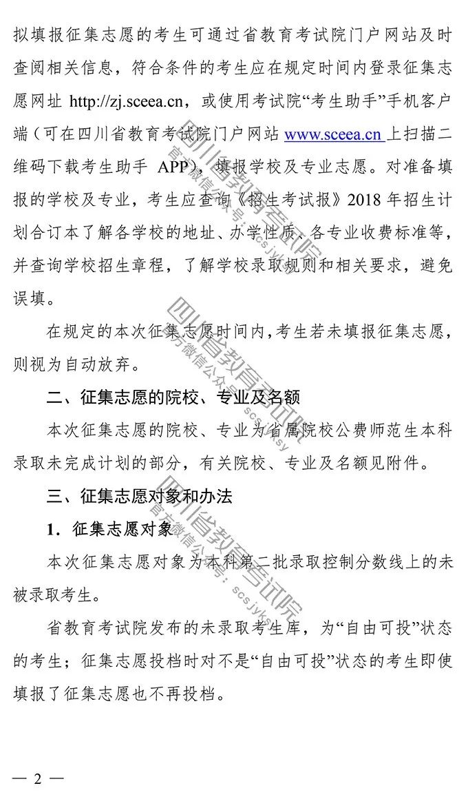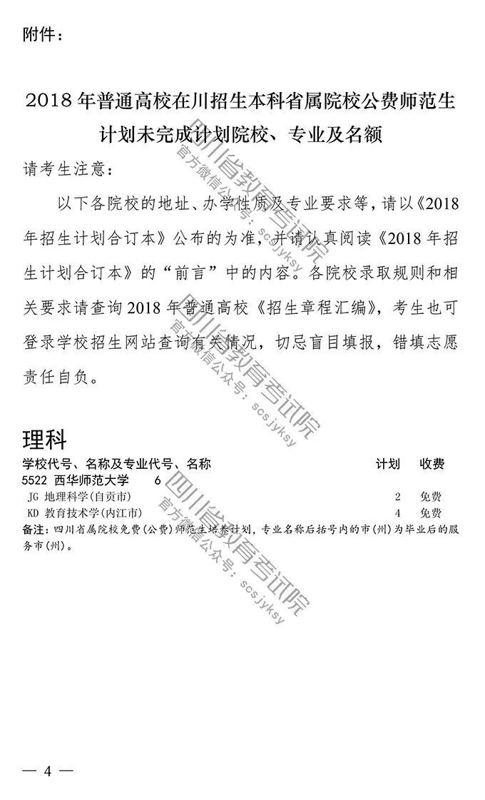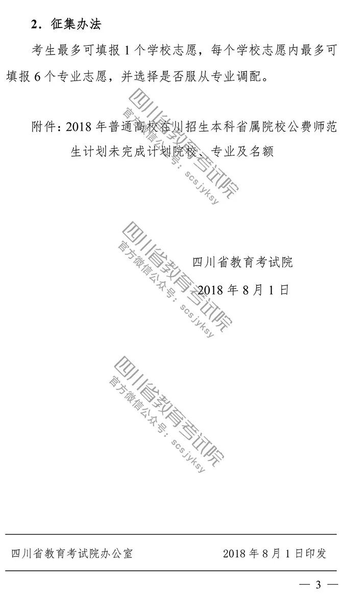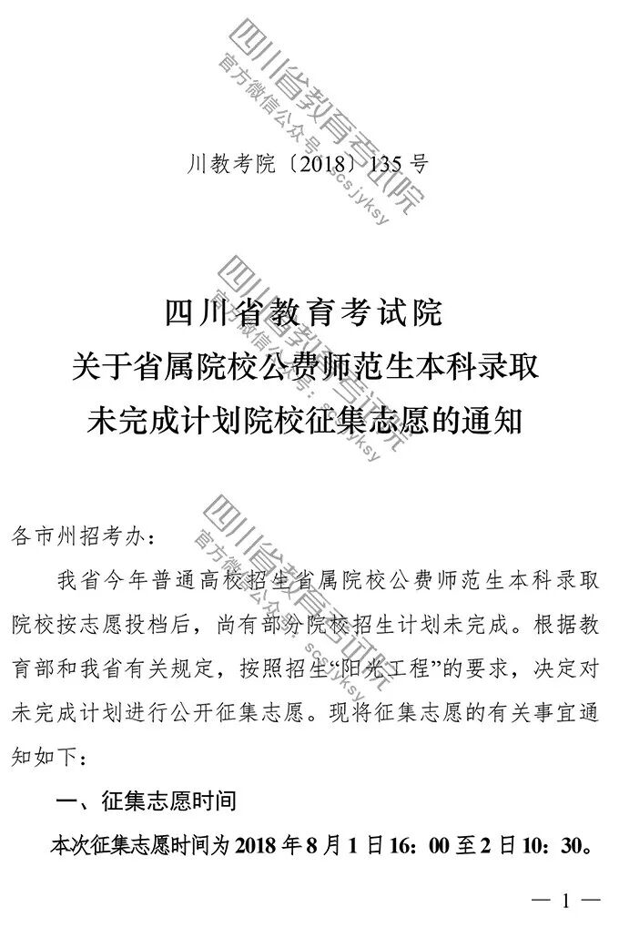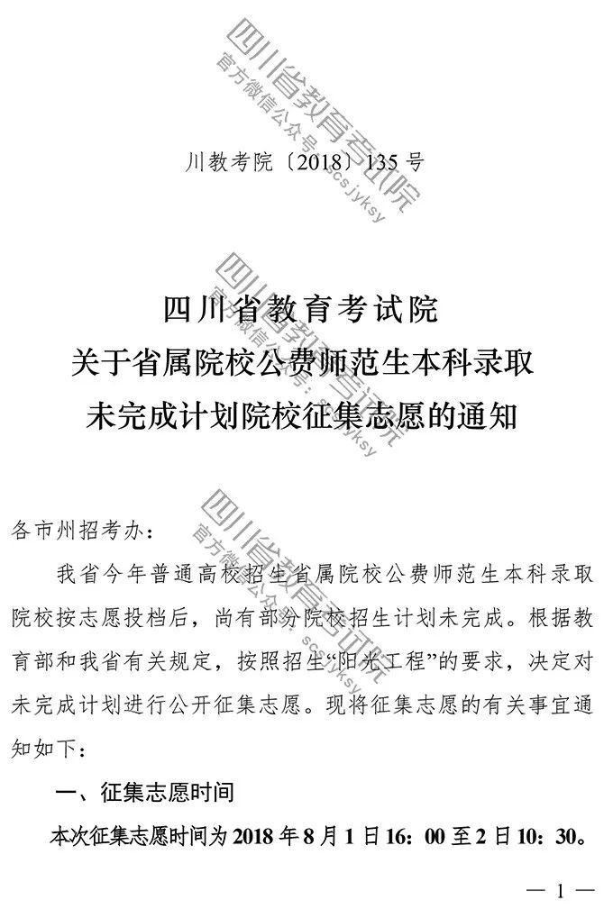 关于四川2018省属院校公费师范生本科录取未完成计划院校征集志愿的通知