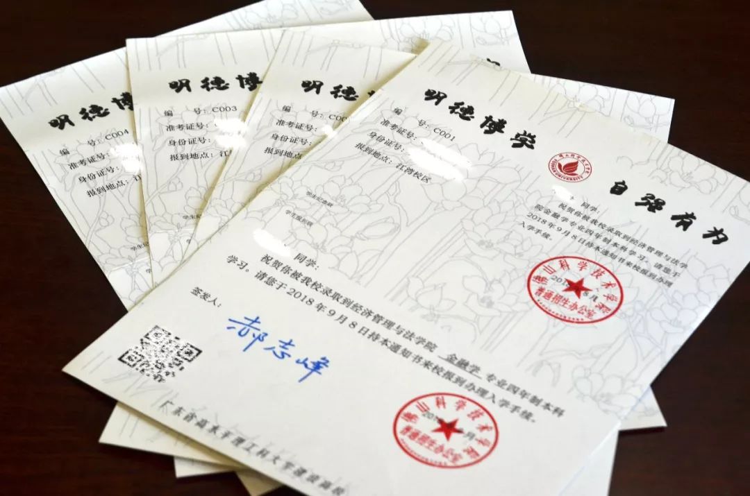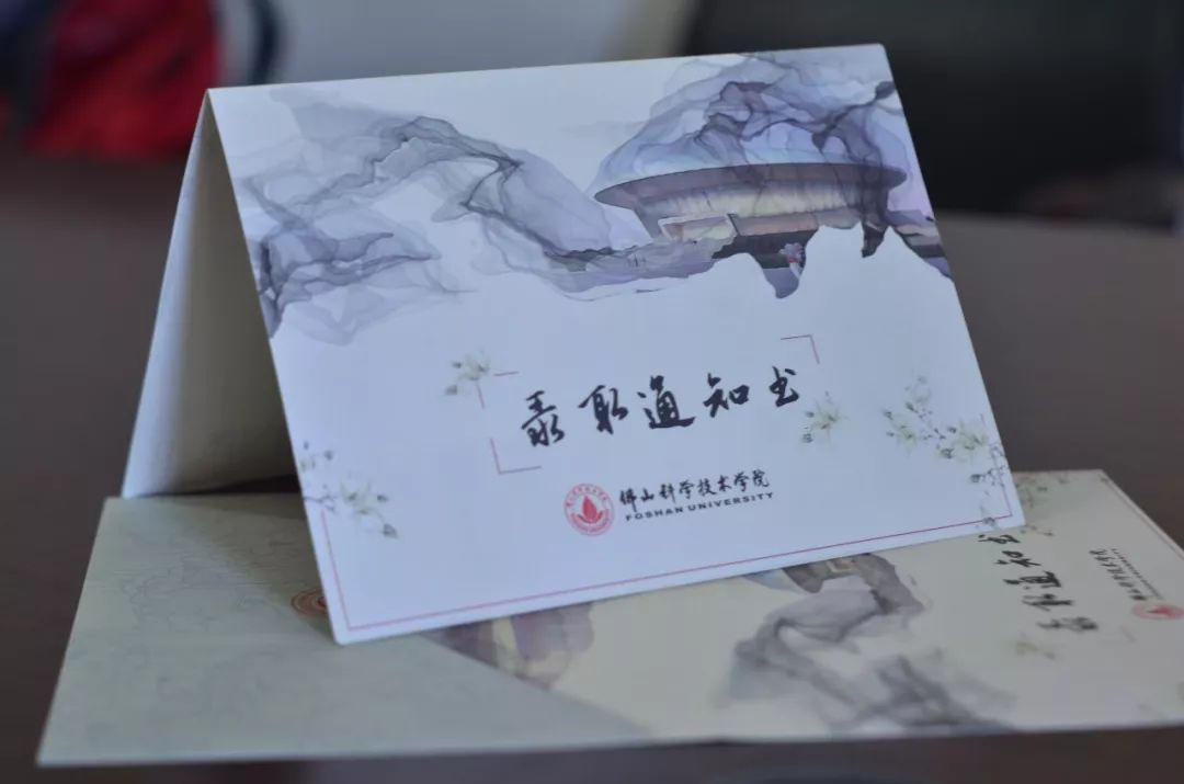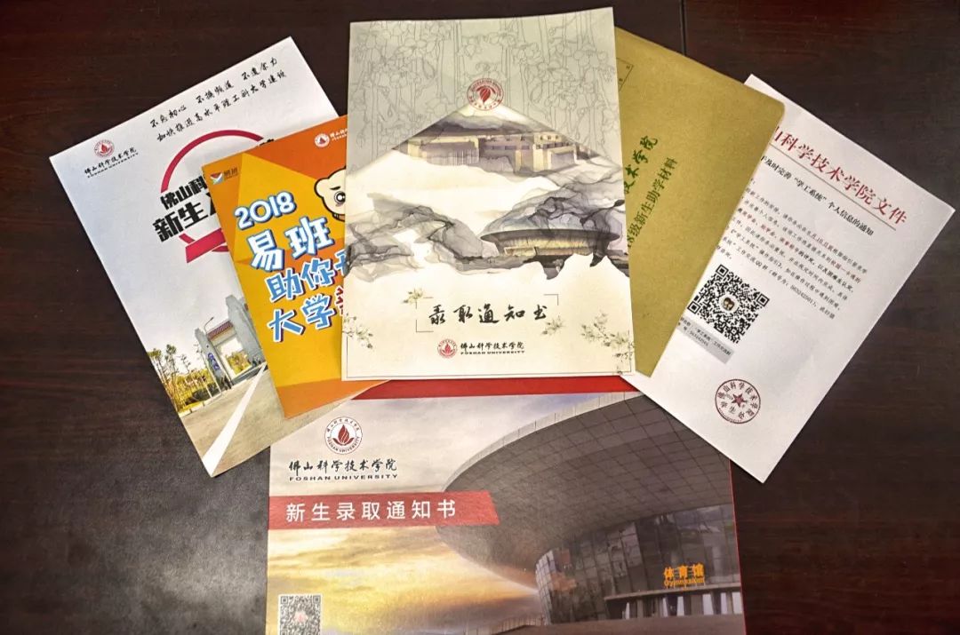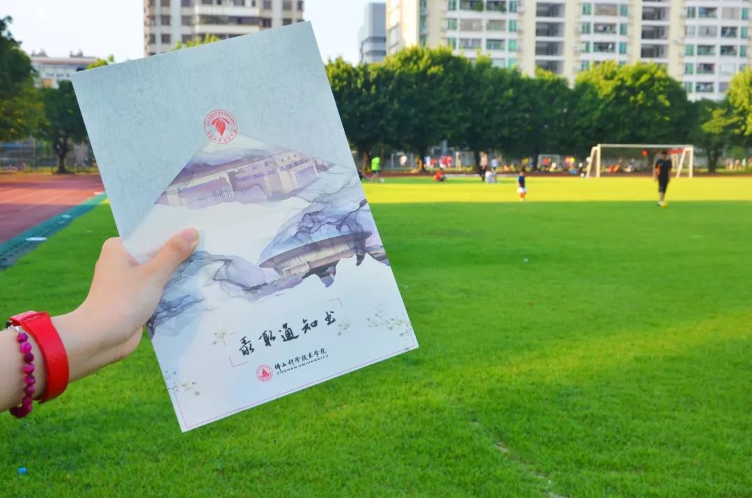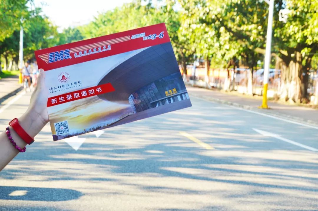 录取通知书创意小设计 今年录取通知书设计采用两折对称设计,分为学生纪念联和学生报到联,学生可以沿着折痕剪下学生纪念联,收藏珍贵的录取通知书,而且在通知书里面也加入了很多佛山科学技术学院仙溪新校区的印记。封面就融入了佛山科学技术学院标志性的仙溪校区体育馆和仙溪校区图书信息中心的建筑元素,封底印上了佛山科学技术学院“明德博学,自强有为”八字校训,提醒每一位佛科院新生要恪守校训。 “除了录取通知书还有什么内容呢?” “今年录取通知书的颜值如何呢?” 小招君为你献上录取通知书的“户外写真集”