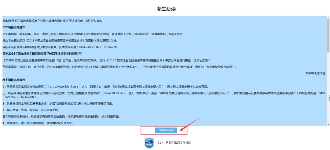 1.符合条件的考生可凭准考证号和本人密码登录黑龙江省招生考试信息港(http://www.lzk.hl.cn),进入“网报中心”选择“2018年黑龙江省高考网上填报志愿入口”,进入网上填报志愿考生必读页面
