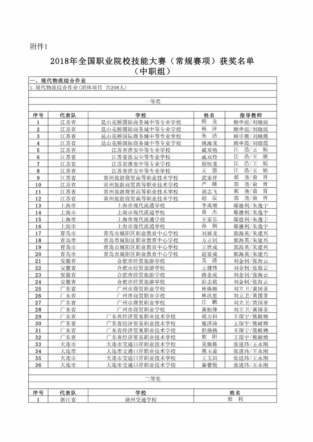 附件:1.2018年全国职业院校技能大赛(常规赛项)获奖名单(中职组)