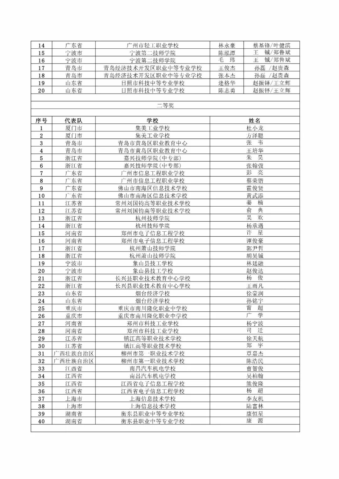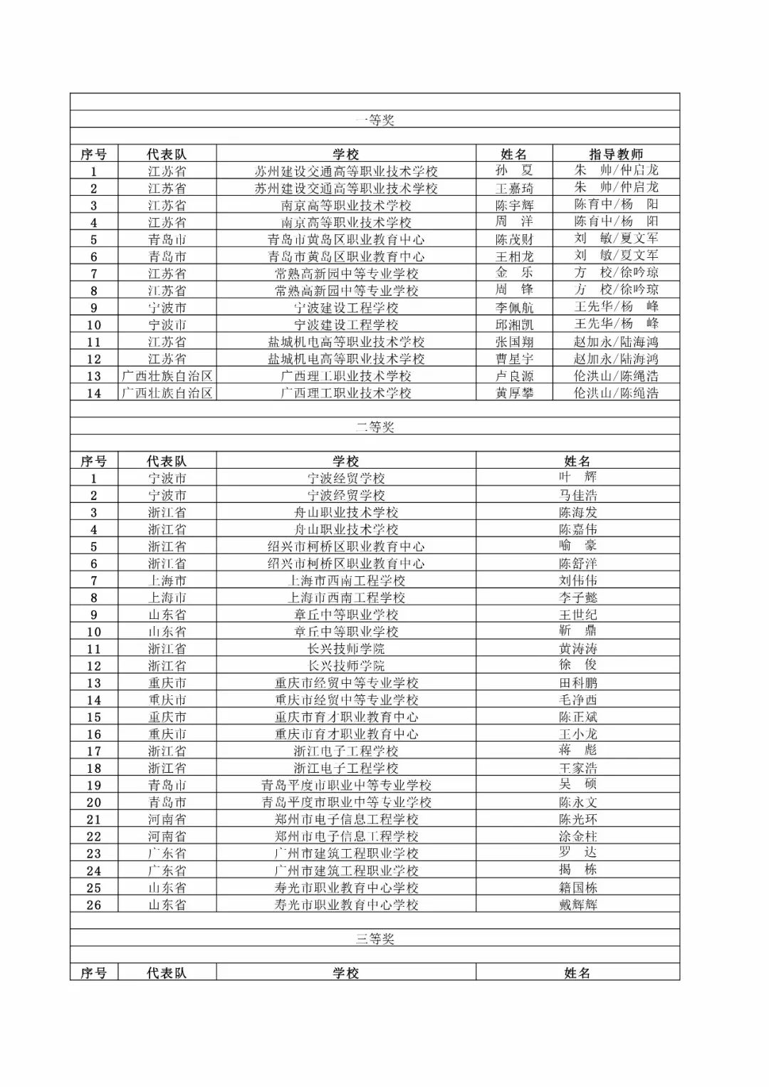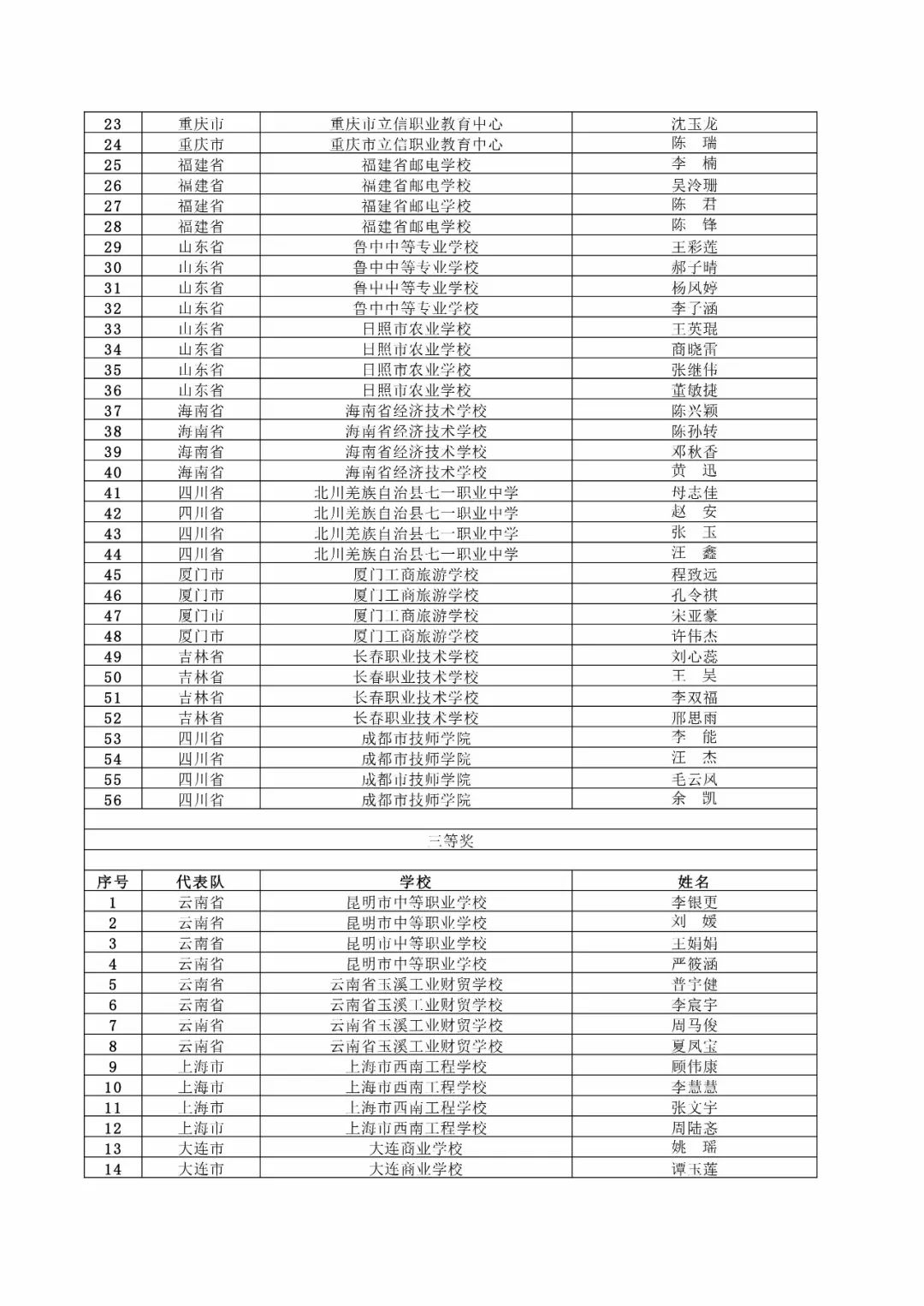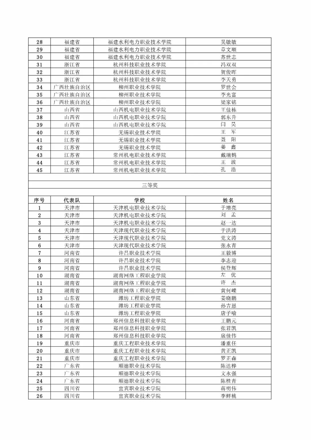 2018年全国职业院校技能大赛常规赛项于5月6日至6月30日在天津主赛区和北京、山西、内蒙古、辽宁、吉林、江苏、浙江、安徽、福建、山东、河南、湖北、湖南、广东、重庆、四川、云南、陕西、甘肃、宁夏、青岛、宁波等22个分赛区成功举行。共有来自全国37个地区的14907名选手参加了中、高职组74个项目的比赛。根据选手的竞赛成绩,经分赛项执委会审定、大赛组委会同意,现公示一、二、三等奖获奖选手、优秀指导教师及所在学校名单(见附件)。