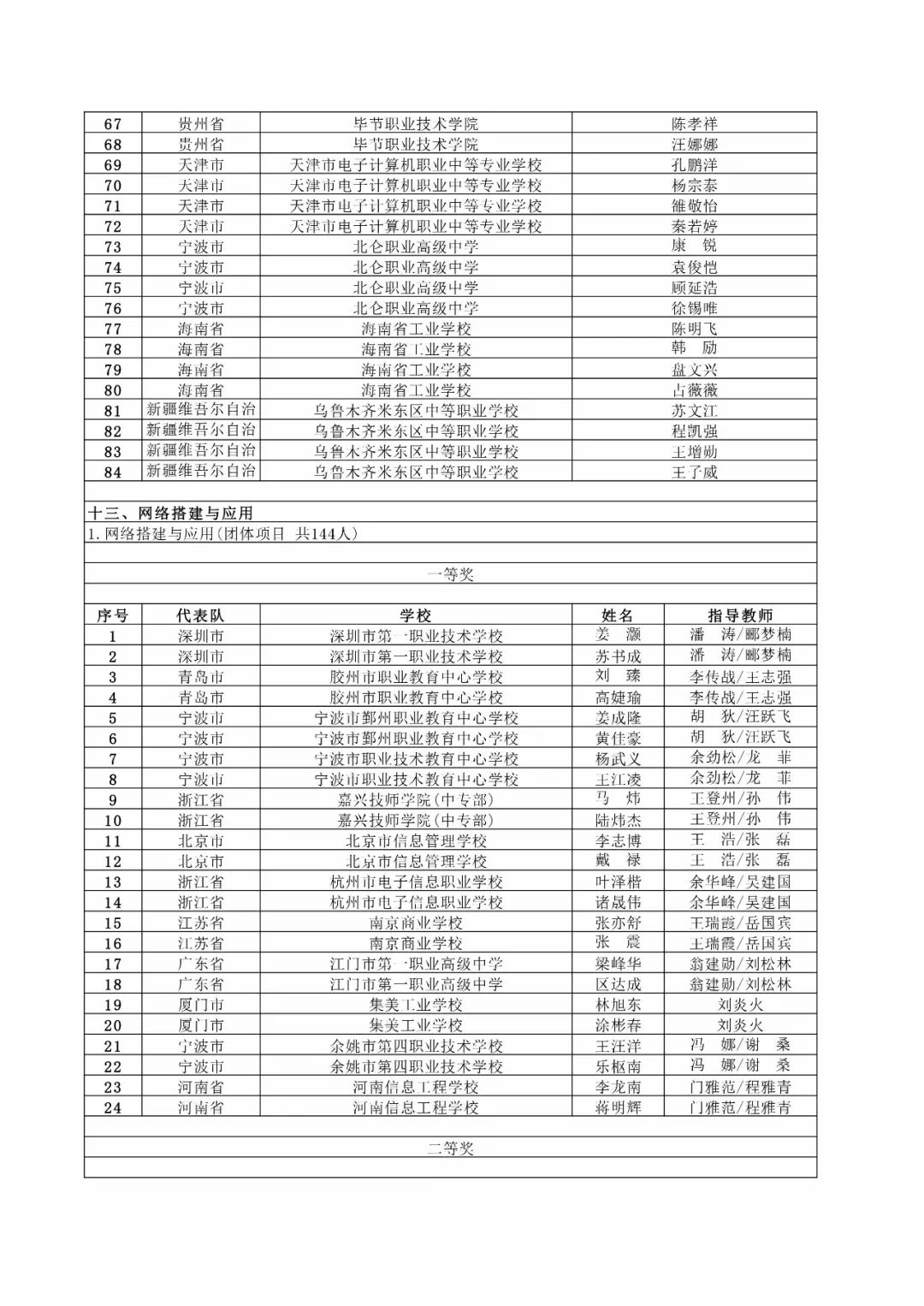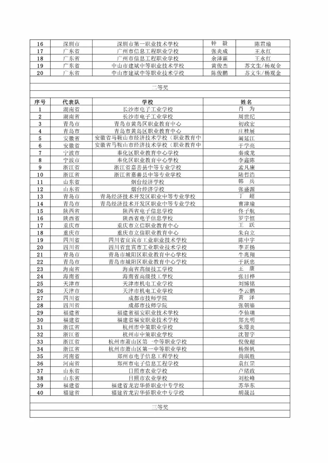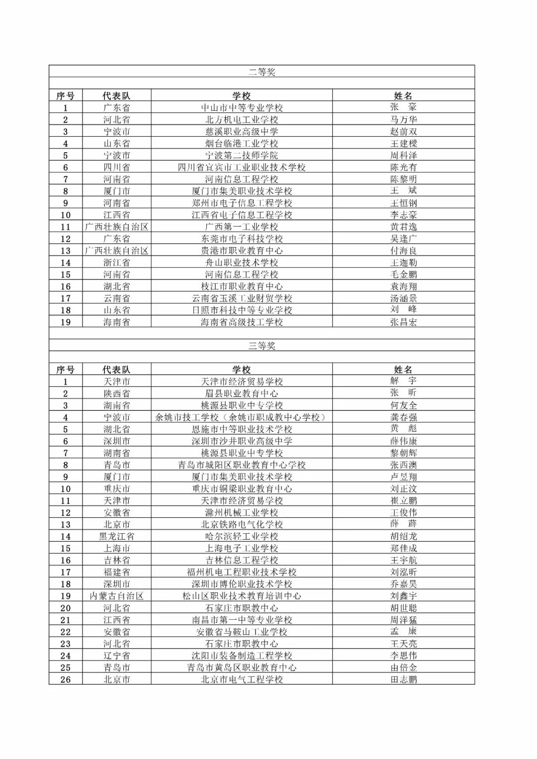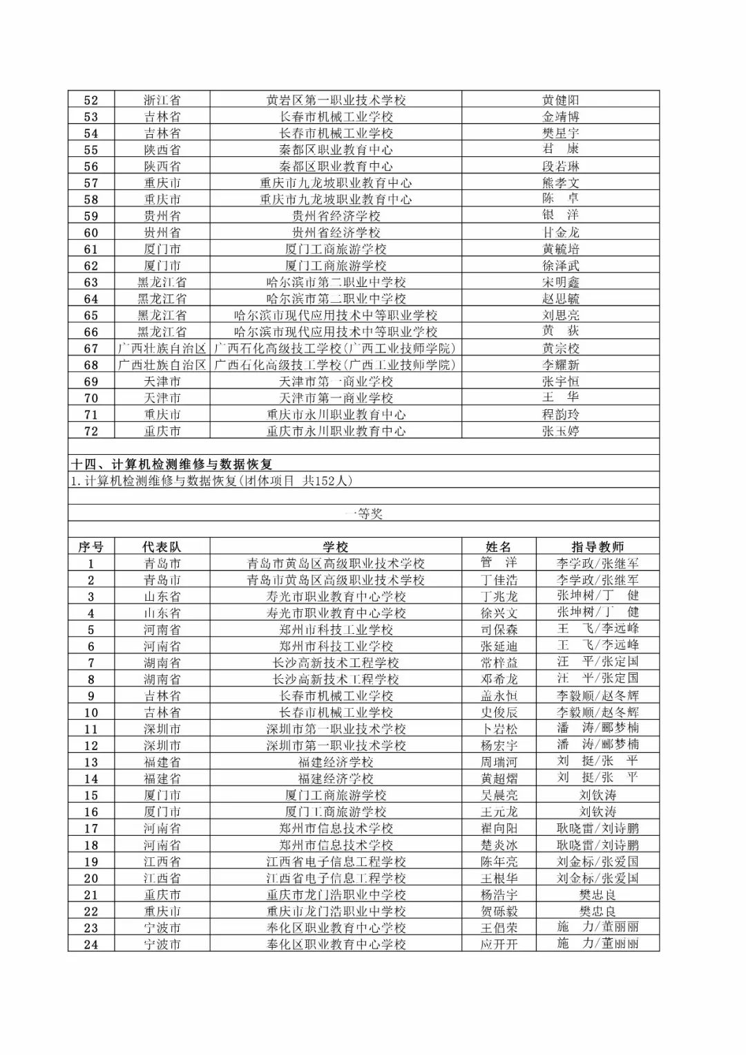 2018年全国职业院校技能大赛常规赛项于5月6日至6月30日在天津主赛区和北京、山西、内蒙古、辽宁、吉林、江苏、浙江、安徽、福建、山东、河南、湖北、湖南、广东、重庆、四川、云南、陕西、甘肃、宁夏、青岛、宁波等22个分赛区成功举行。共有来自全国37个地区的14907名选手参加了中、高职组74个项目的比赛。根据选手的竞赛成绩,经分赛项执委会审定、大赛组委会同意,现公示一、二、三等奖获奖选手、优秀指导教师及所在学校名单(见附件)。