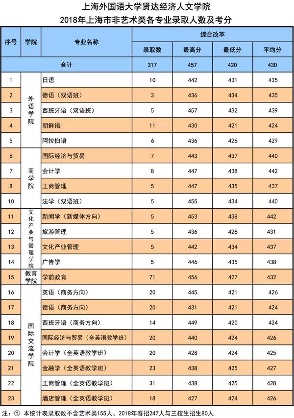 上海外国语大学贤达经济人文学院2018年上海市分专业录取分数线