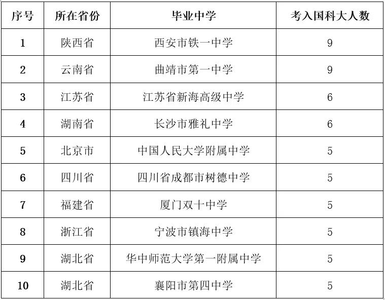 录取人数最多的两所学校分别是陕西省西安市铁一中学和云南省曲靖市第一中学,分别录取了9名学生。