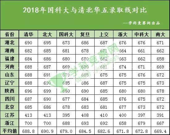 国科大各个省份的录取分数线与清华北大、华东五校的对比如下: