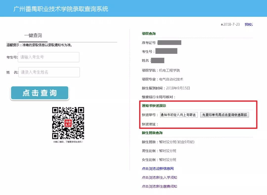 三、我校录取查询系统查询 登录广州番禺职业技术学院录取查询系统,查询考生最后所录取专业。 四、手机短信推送 我校将向已录取考生在高考志愿填报系统绑定地手机号码推送录取结果。 录取通知书将在8月中上旬发出,考生可通过我校录取查询系统跟踪录取通知书快递动态。收到录取通知书时,可千万别忘了辨真伪哦。 一、录取通知书邮寄跟踪 录取通知书初定于8月中上旬由中国邮政EMS寄送,届时可登录我校录取查询系统。 跟踪录取通知书快递动态: http://gkzs.gzpyp.edu.cn/zs/luqu/ 点击登录网站,输入考生号和姓名、查询通知书邮件号码----复制个人邮件号码----登录网站跟踪查询 二、录取通知书辨真伪 普通高考录取的每份正式的通知书必须符合以下四个条件,缺一不可。 1.我校新生录取通知书由中国邮政EMS寄送,信封印有广州番禺职业技术学院录取通知书字样,其他多余快递,非由我校寄出,请同学注意甄别。 2.学校为每位新生办理了中国银行专用缴费账户,寄送袋中并无银行卡。 3.我校现无任何官方新生交流群,在一切学生自行组织的微信群、QQ群中,请新生提高防范意识,谨防被骗。