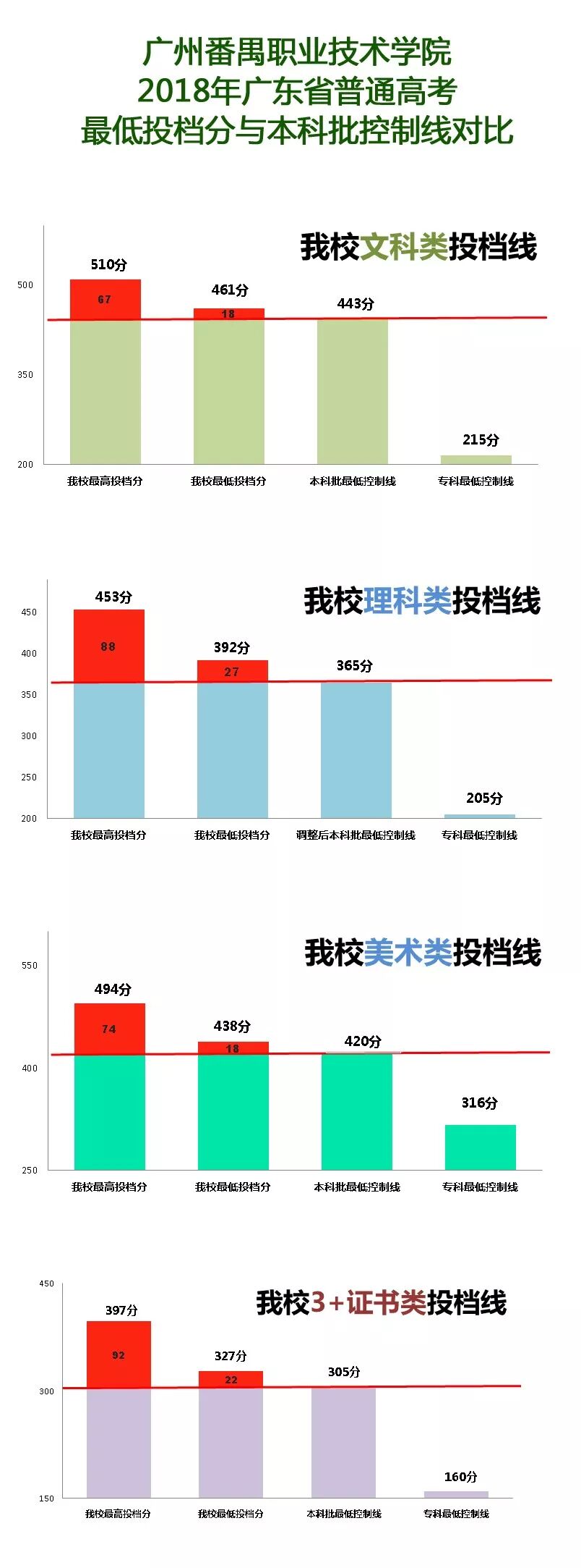 1.美术类最低投档分:美术类总分:438(且最低专科排位 20441) 2.2018年,我省艺术类统考专业实行平行志愿投档,在考生文化课成绩、术科统考成绩双上线的基础上,按公式(文化课成绩×40%+术科统考成绩×2.5×60%)合成总分(即美术类总分)从高到低进行投档。 3.我校在美术类专业录取时,在高考文化成绩和省术科统考成绩双上线的基础上,术科分、文化分按比例合成总分,合成总分=(高考文化成绩/750×0.4)+(术科统考成绩/300×0.6),按合成总分由高到低录取。当考生合成总分相同时,术科成绩较高的考生优先录取。