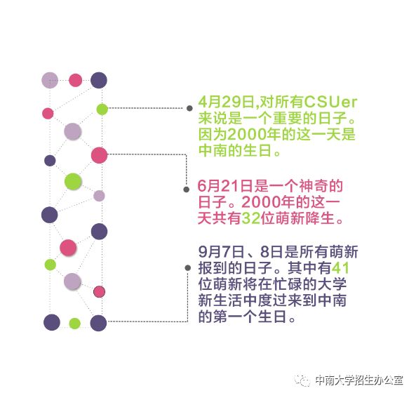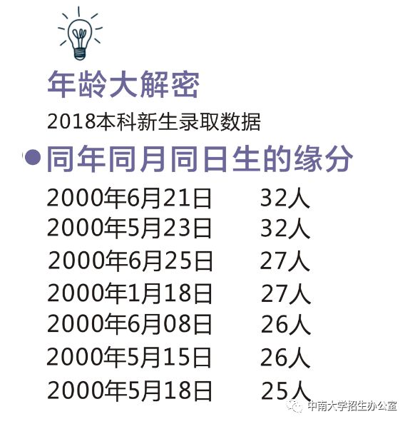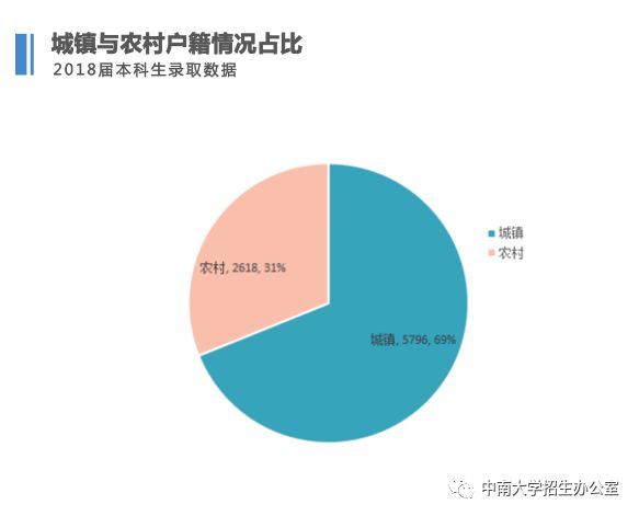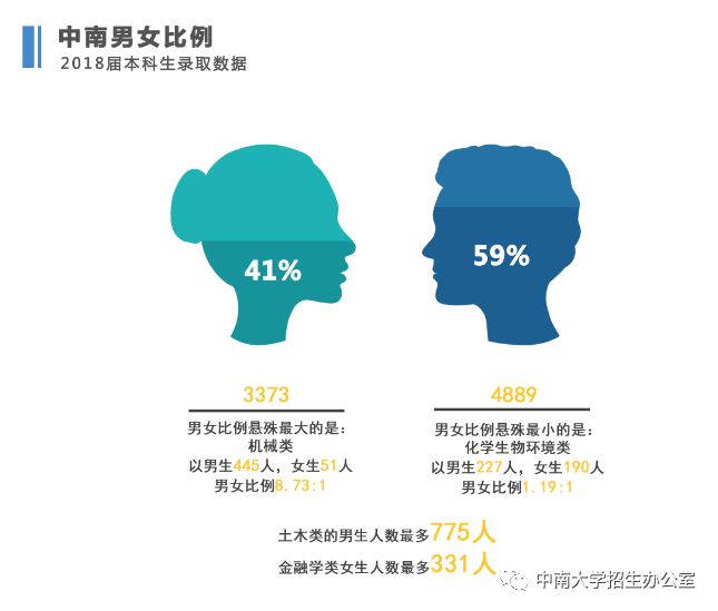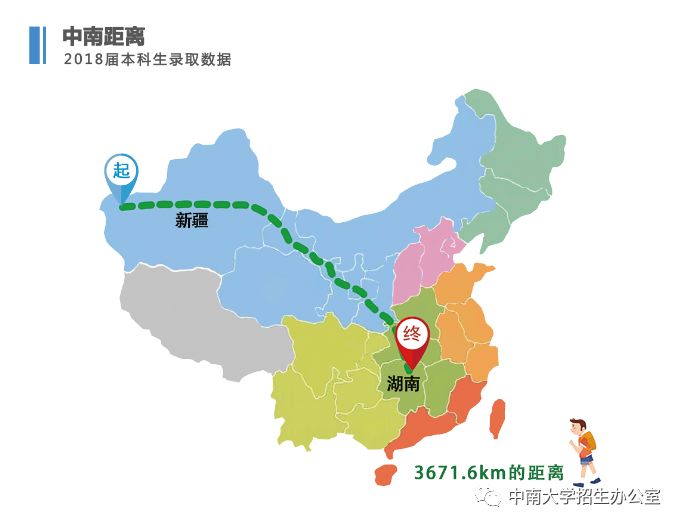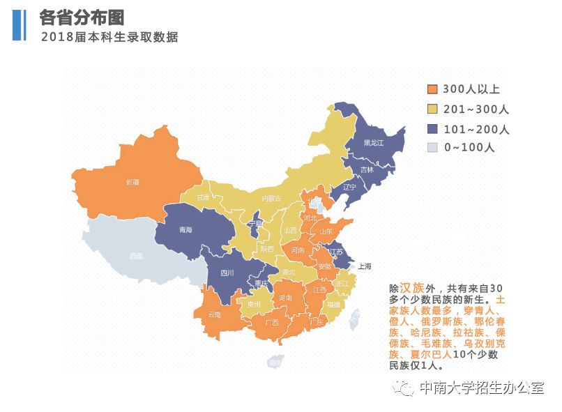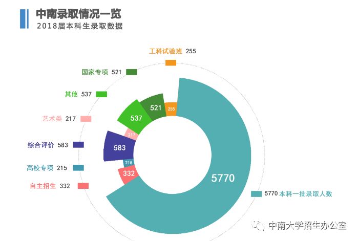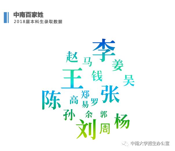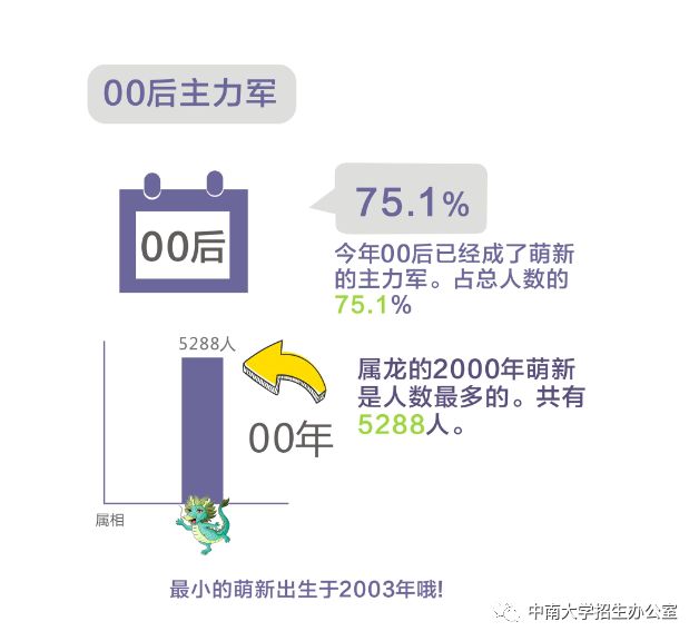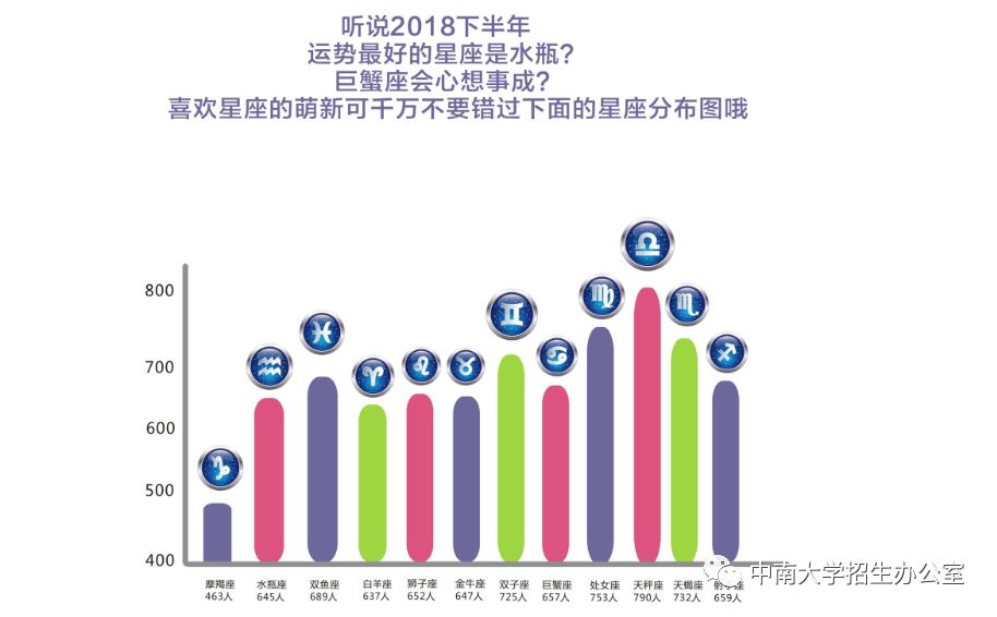 《2018中南新生绝密档案》 数据篇 2018年中南共录取新生8313人 其中本科一批录取人数共计5770人 特殊类型录取人数共计2543人 详情请看下面的各招生类型招生情况图 其中今年首次招收了 台湾学测生58人和香港免试生11人 多样化的招生方式 广泛吸收各式人才 中南始终走在时代前列 今年是中南第一次进行大类招生 土木安全类以1003人的总人数荣登榜首 冶金材料类和自动化与电气类紧随其后 其中化学生物环境类以 男生227人,女生190人 男女比例1.19:1获得最均衡的大类称号 比起全校新生男女比例1.45:1确实多了不少机会哦 生活篇 新朋友见面第一件事自然是自报姓名 中南百家姓的排行前六位的姓氏占录取新生总数比例竟高达35.1% 李姓——581人,占录取新生总数6.9% 王姓——548人,占录取新生总数6.6% 张姓——509人,占录取新生总数6.1% 刘姓——447人,占录取新生总数5.4% 陈姓——343人,占录取新生总数4.1% 杨姓——295人,占录取新生总数3.6% 其中在冶金材料类、地信类等多个大类有6位 名叫“陈龙”的新生 是不是很有缘~ 刚刚从天南海北聚集到中南的萌新们 最有共同语言的莫过于老乡啦 湖南省蝉联多年招生人数之最 紧随其后的是河南省和山东省 此外萌新们一共来自38个民族 少数民族中人数最多的前三位 分别是土家族、回族、蒙古族 今年的萌新中城镇户籍占比68.89% 农村户籍占比31.11% 说到家乡 今年有4位家住新疆克州的萌新 是从祖国的最西边跨越万水千山来到中南 最远的一位直线距离相距3671.6km 不要担心 小招相信中南的热情 一定能消除你们长途跋涉的辛苦 高中校友变大学校友 同样是一件让人惊喜的事 萌新数量前五的学校分别是 长郡中学 长沙市雅礼中学 长沙市一中 湖南师大附中 河北衡水中学 八卦篇 今年00后已经成了萌新的主力军 占总人数的75.1% 属龙的2000年萌新是人数最多的 共有5288人 最小的萌新出生于2003年~ 4月29日 对所有CSUer来说 是一个重要的日子 因为2000年的这一天是中南的生日 今年中南又遇到了14位可以一起过生日的萌新 6月21日 是一个神奇的日子 2000年的这一天共有32位萌新降生 9月7日、8日 是所有萌新报到的日子 其中有41位萌新 将在忙碌的大学新生活中 度过来到中南的第一个生日~ 听说2018下半年 运势最好的星座是水瓶? 巨蟹座会心想事成? 喜欢星座的萌新可千万不要错过下面的星座分布图~ 新校图书馆前的双子树今年又遇上了一对双子 来自河南的古氏姐妹花 分别录取在外国语言文学类和经济管理类 串门的时候说不定能给同学一个惊喜哦 祝愿她们接下来能像双子树一样共同茁壮成长!