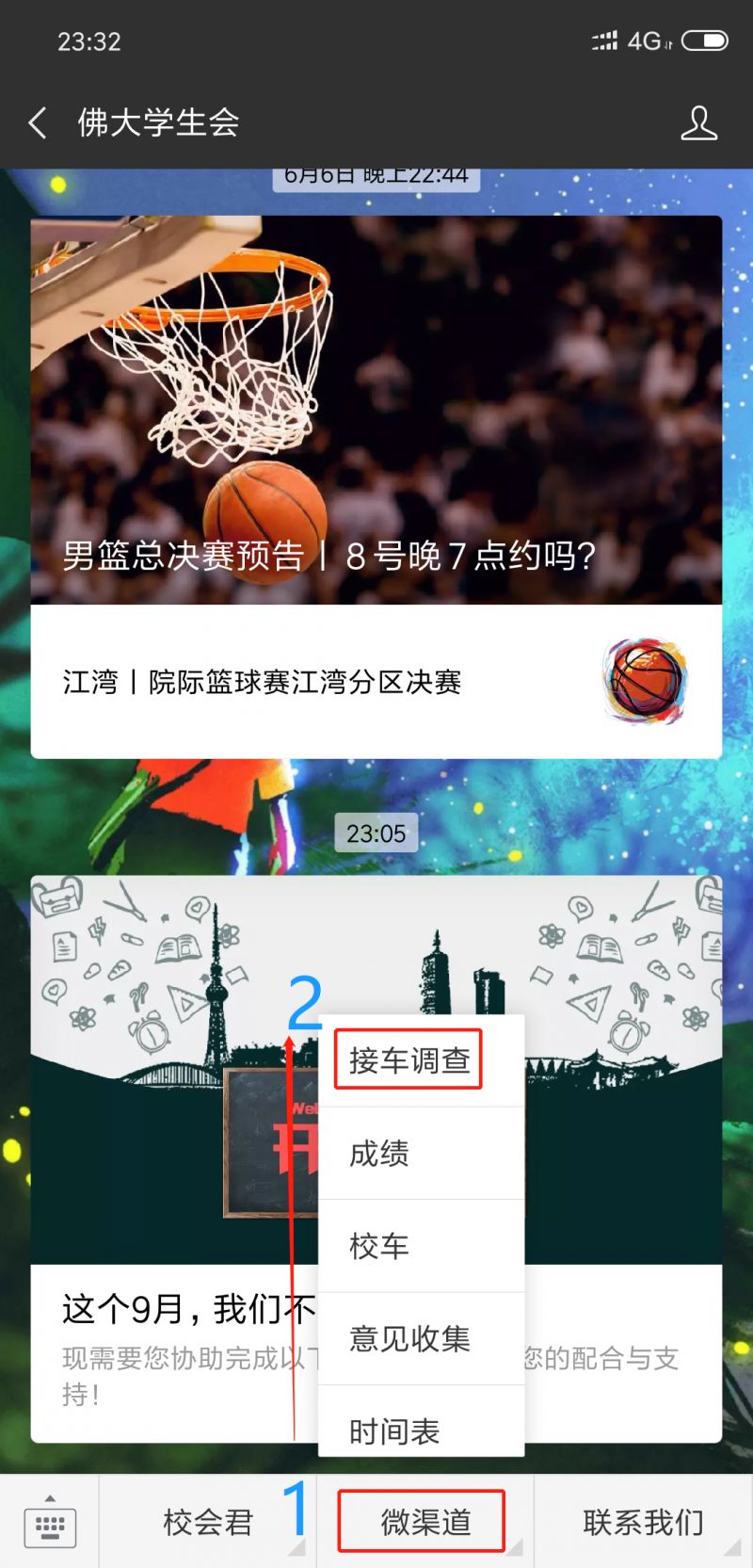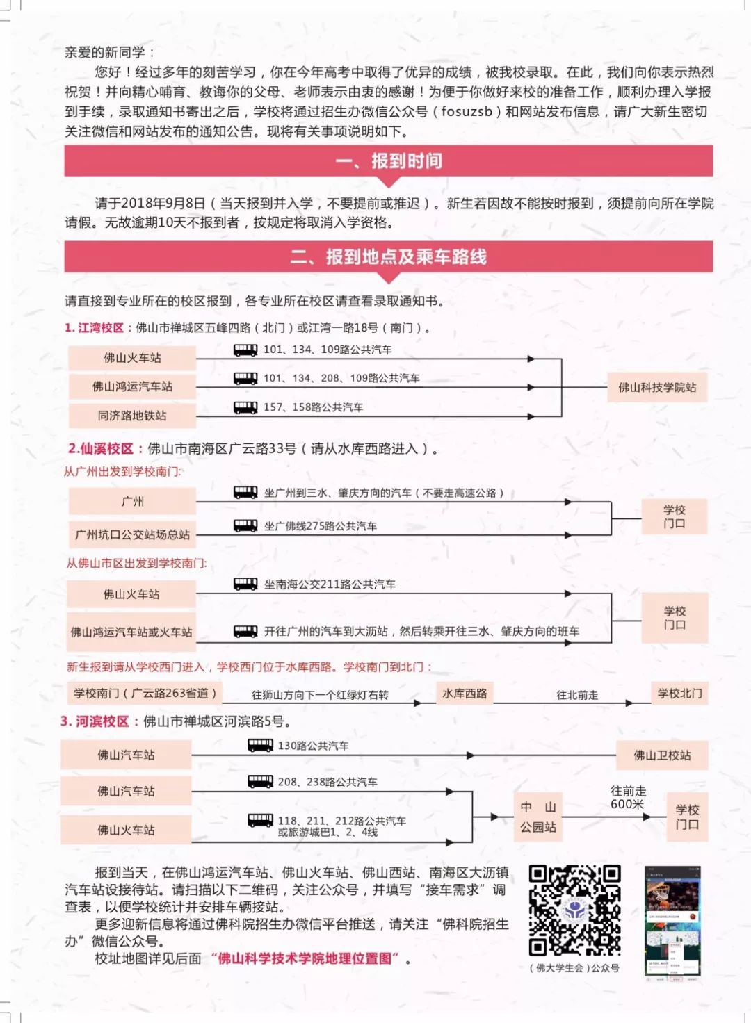 报到当天,在佛山鸿运汽车站、佛山火车站、佛山西站、南海区大沥镇汽车站设接待站。请扫描以下二维码,关注公众号,并填写“接车需求”调查表,以便学校统计并安排车辆接站。