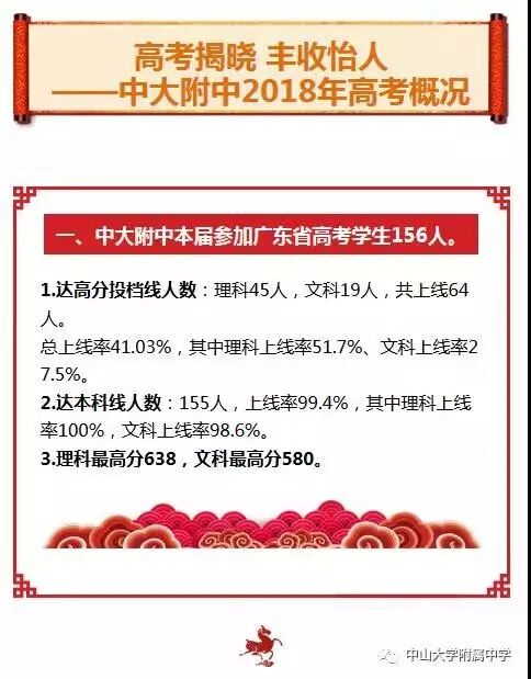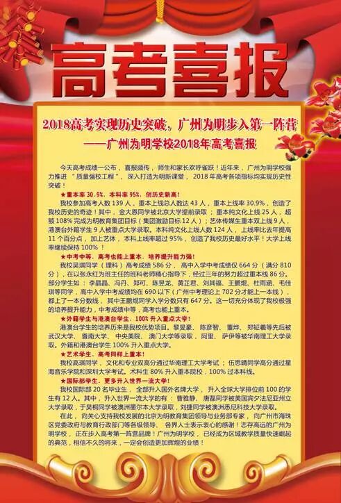 4、重本上线率:3人上文化重本;音乐重本上线5人;美术重本上线6人;传媒上重本线9人;国外重本33人,其中李林冰同学、刘俊杰同学分别提前被广州体育学院和广州大学录取。