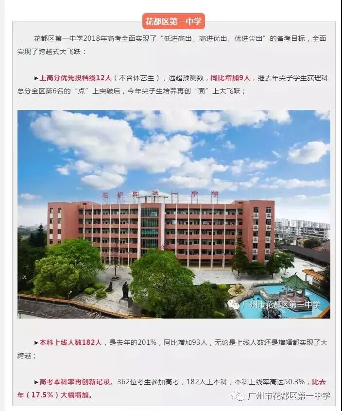 1、文理合计重本率72.4%,与该校2017年高考创造的广州民办学校重本率历史新高相比,进一步上升12个百分点,居广州一流、花都第一;
