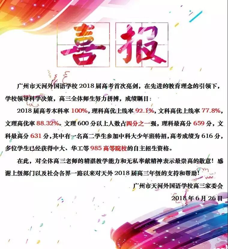 创造了历史新高;高分优先投档线上线率达74.2%,本科上线率达99%。特别突出的是我校创新班高三(3)班600分以上高分率达100%,平均分高达635分;文科黄愉悦同学以636的高分获天河区文科总分第一名;理科刘润同学666分,居全区理科总分第二名,理科辜中天同学665分,居全区理科总分第三名;李瑾同学被清华大学录取;庄之彦、纪听乔两位同学分别被中国科技大学少年创新班和中国科技大学少年班提前录取。