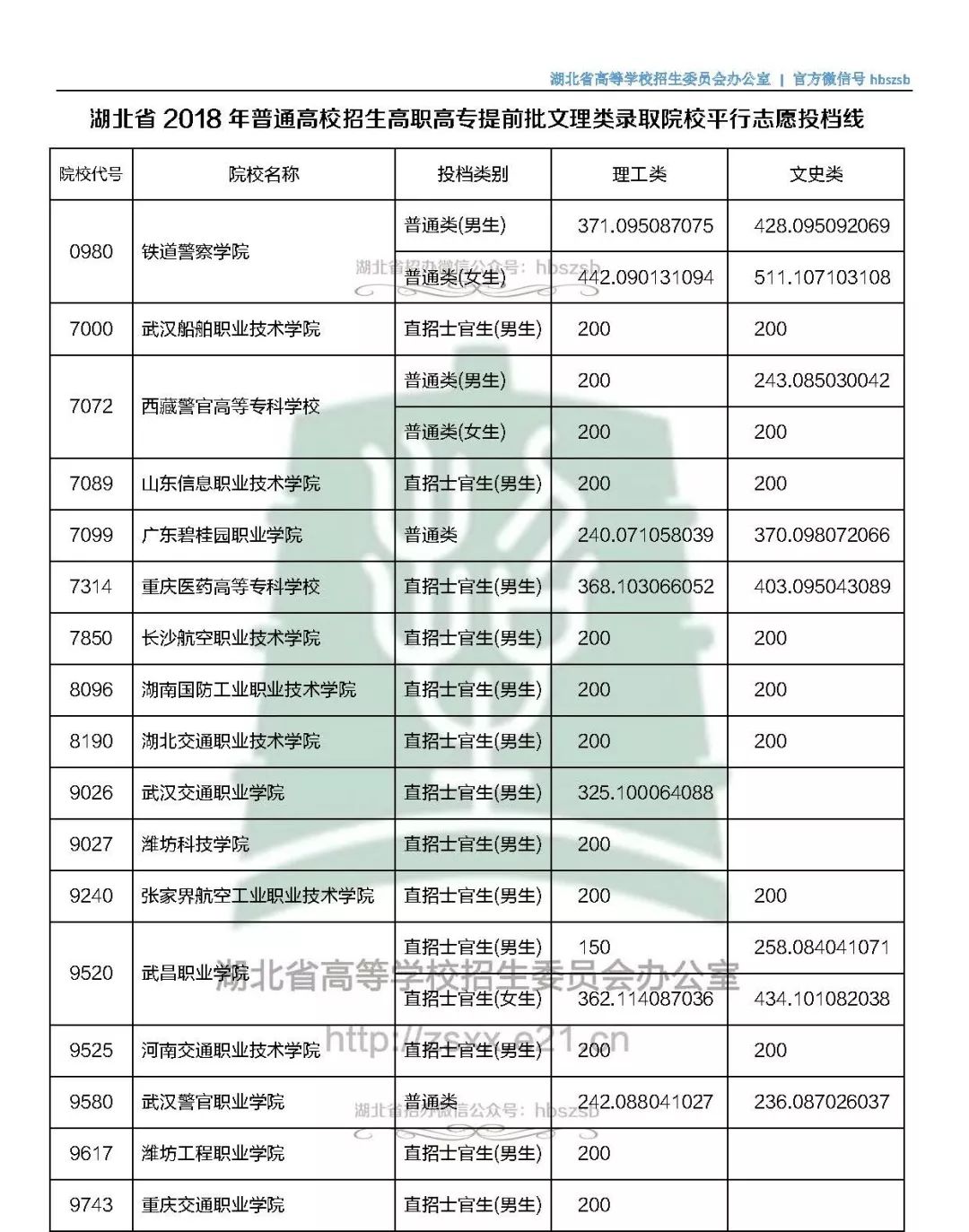 湖北省2018年普通高校招生高职高专提前批文理类录取院校平行志愿投档线