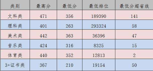 美术类录取最低分363分,超省线47分;音乐类录取最低316分,超省线15分;体育类录取最低352分,超省线2分;