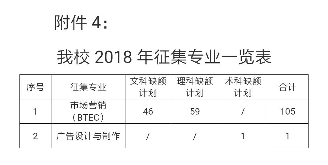 按照广东省教育考试院的工作安排,下一阶段(8月7-9日)我校市场营销(BTEC)、广告设计与制作尚有部分计划缺额,需要进行志愿征集,各专业缺额情况见附件4。