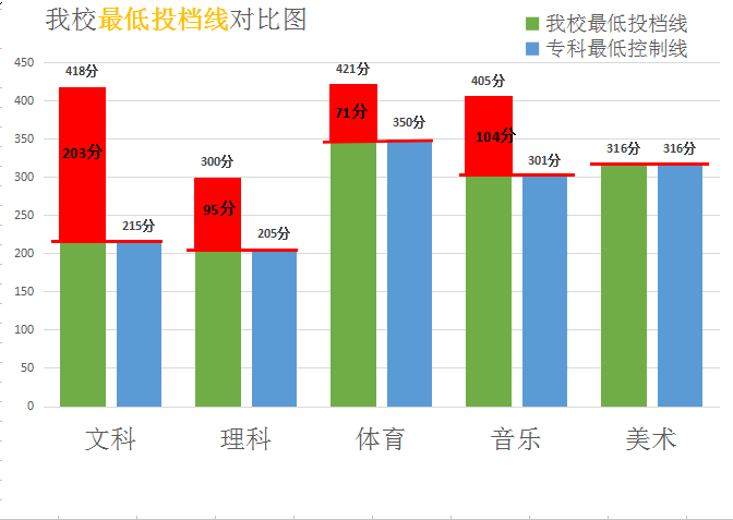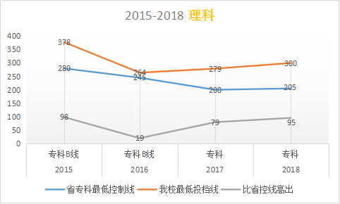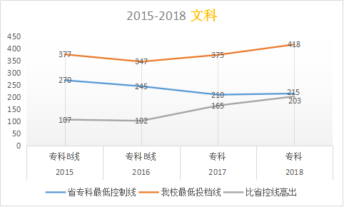在本次投档中: 从最低投档线看,文科最低投档线为418分,高出省控制分数203分,共出档644人;理科最低投档线为300分,高出省控制分数95分,共出档1202人。 从考生成绩看,文科最高分为506分;理科最高分为431分。 从专业分布看,我院特色专业及个别新增专业收到考生的追捧。 艺术类投档情况 科类 最低投档线 最低排位 音乐类 405 6624 体育类 421 6938 美术类 316 38367 往年分数线回顾 今年的投档线已经公布了,就让小编带大家来回顾一下2016年至2017年河职院的最低投档线吧! 文科 年度 批次 省控线 最低投档线 最低排位 2016年 三A 360 367 150653 三B 245 347 172129 2017年 专科 210 375 138827 理科 年度 批次 省控线 最低投档线 最低排位 2016年 三A 330 330 262758 三B 245 264 313343 2017年 专科 200 279 279235