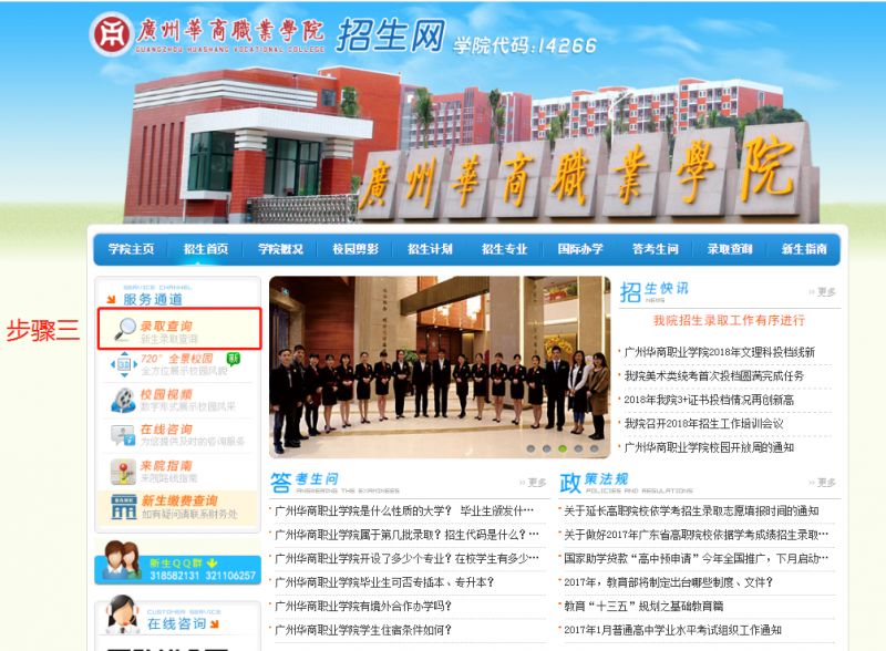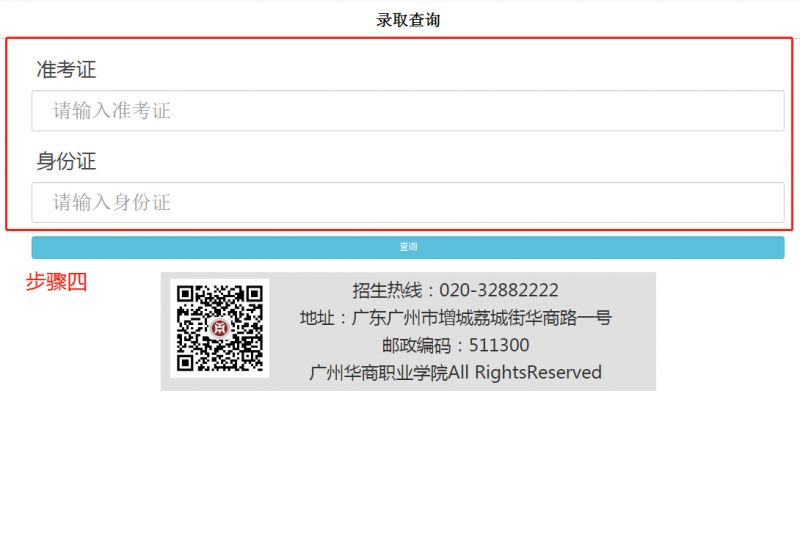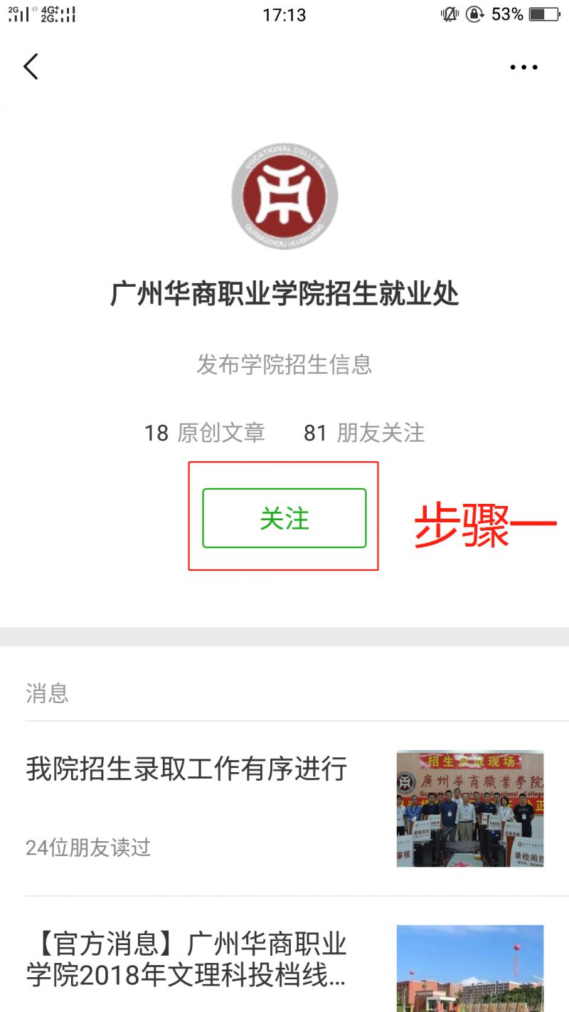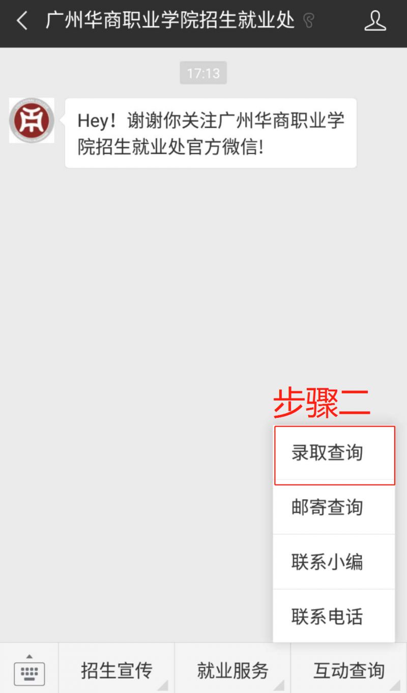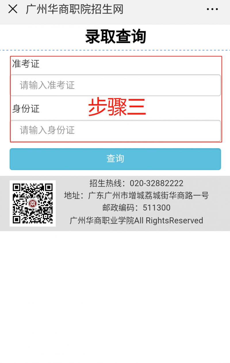 第二种查询方式 第三种查询方式 扫描二维码关注“广州华商职业学院招生就业处”公众号, 浏览下方步骤方可查询
