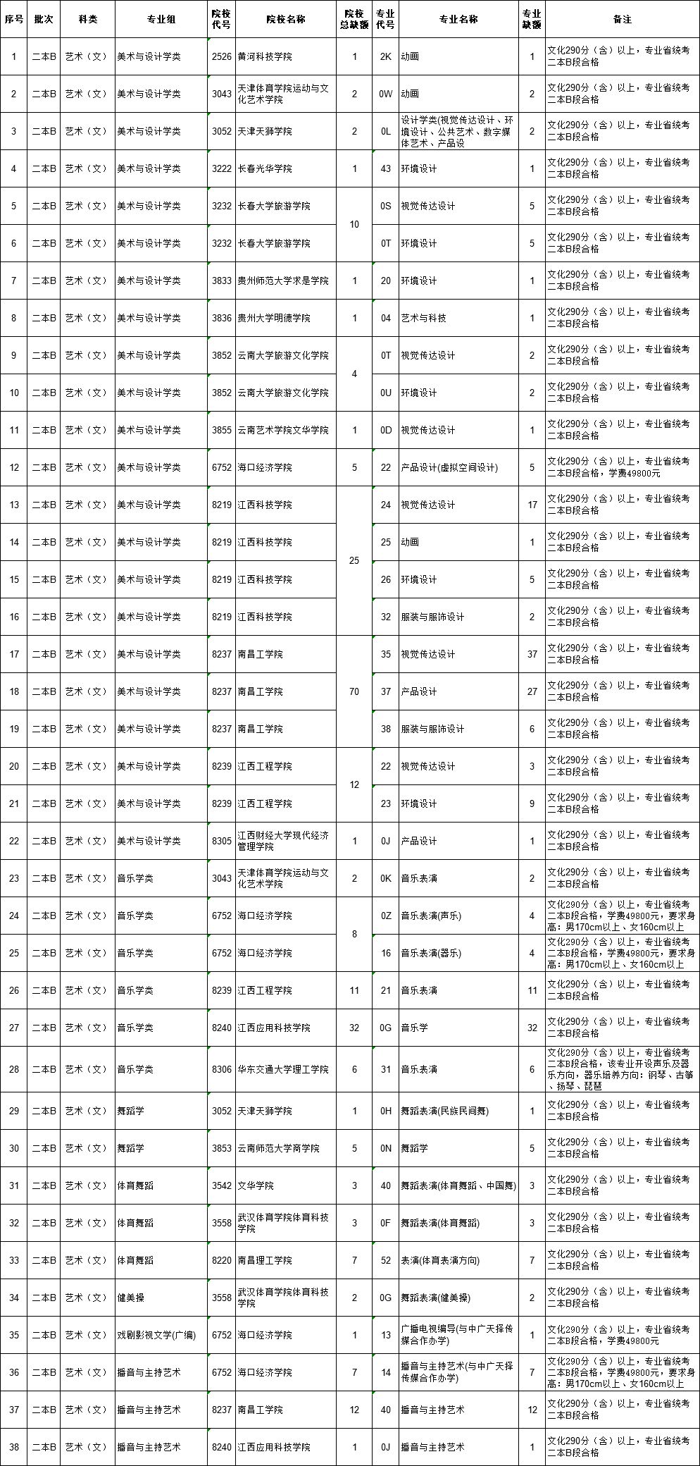 艺术类二本B段平行志愿缺额院校及专业统计表