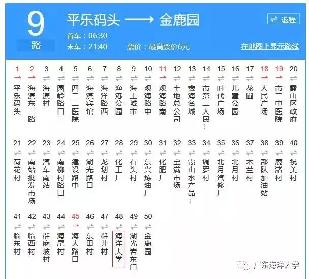 4.汽车南站—海大湖光校区:可在公交车站点(汽车南站)搭乘9路公交车到海洋大学站下车。