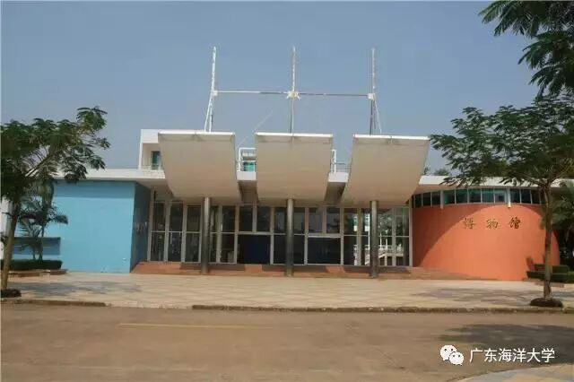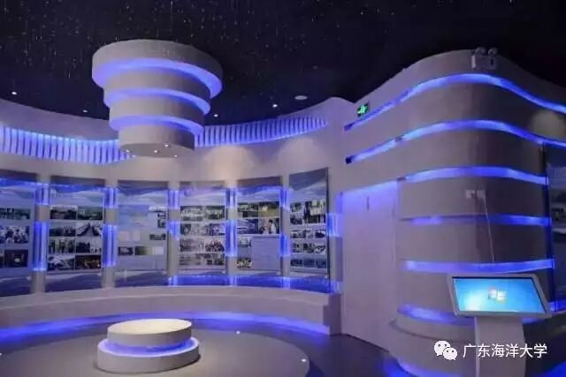 校史馆由湛江校友会捐建,占地420多平方米,全馆以蓝色为主色调,以蜿蜒的形态象征海大发展的悠久历程,以湛蓝缥缈的视感承载海洋梦想,以现代科技手段传承海大精神。
