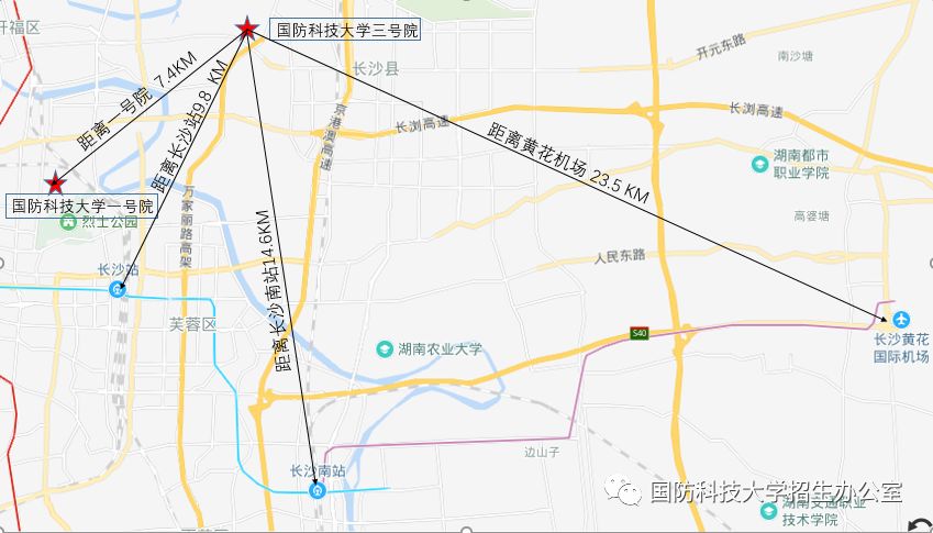 新学员报到地址为国防科技大学三号院(长沙市开福区福元路1号)。距离国防科技大学一号院约7.4公里;距离长沙站(火车站)约9.8公里;距离长沙南站(高铁站)约14.6公里;距离黄花机场约23.5公里。