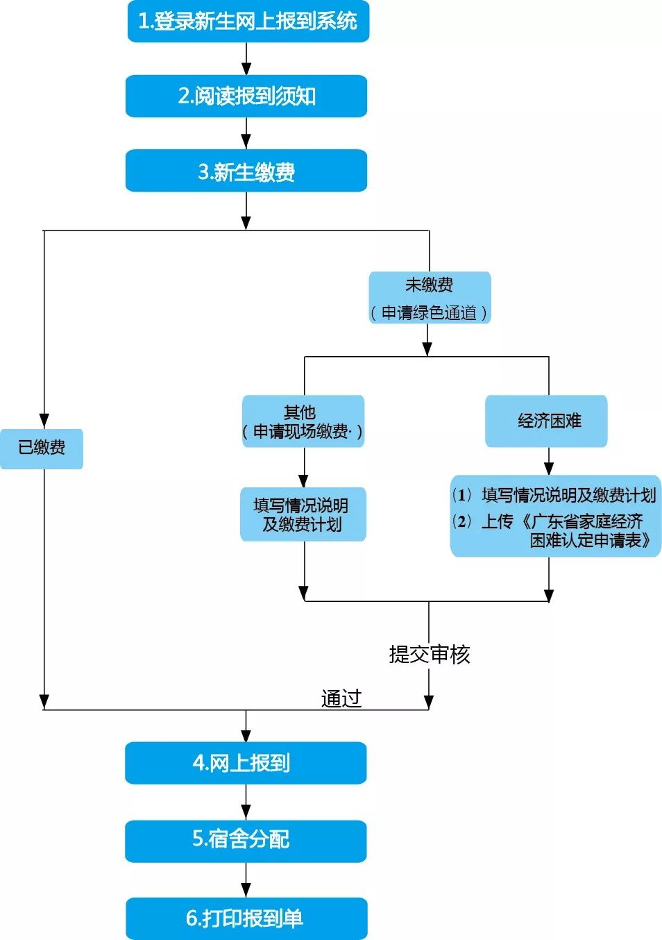 (1)家庭经济困难申请绿色通道缓交学费的学生,填写情况说明及缴款计划并上传《广东省家庭经济困难学生认定申请表》扫描件正反面,且须加盖学生家庭所在地村委会(居委会)、乡(镇)或街道的公章,提交审核。3个工作日后反馈审核结果。如审核通过,则可进行后续报到操作;如未通过则按审核意见操作。