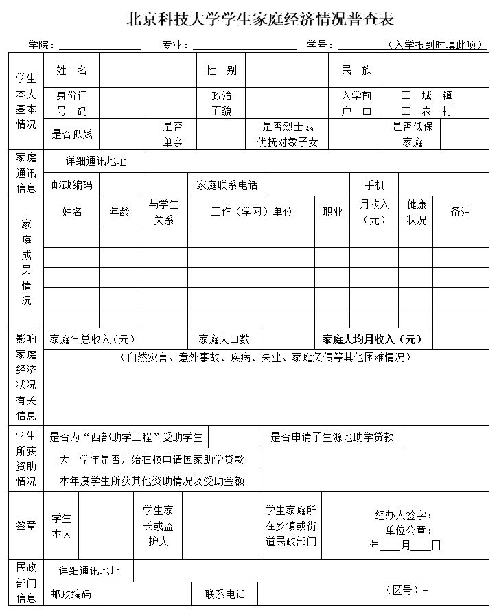 (2)《北京科技大学家庭经济普查表》纸质版;
