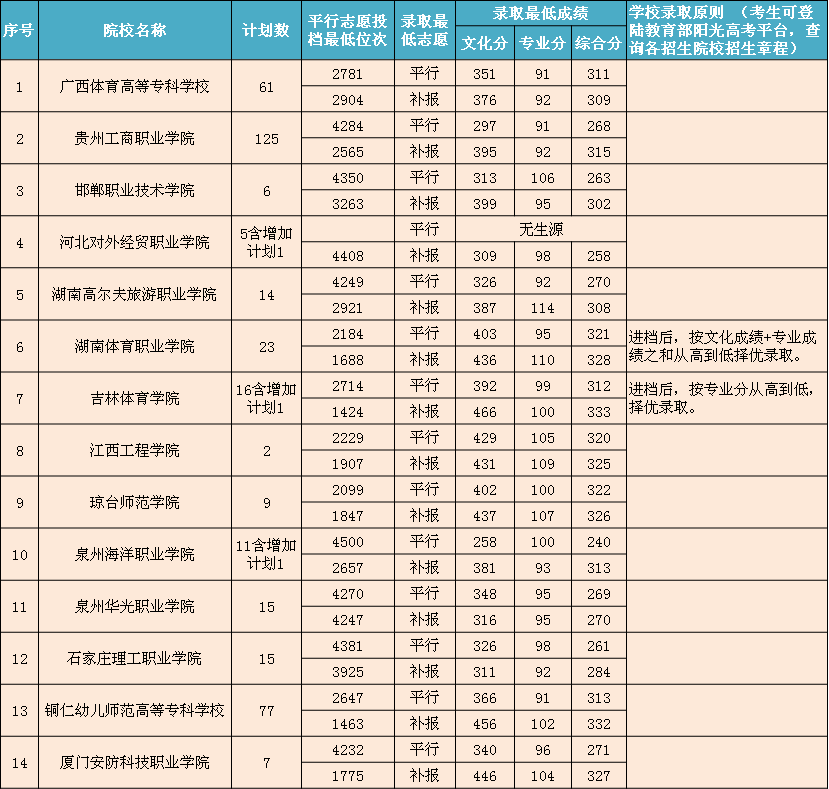 贵州省2018年普通高校招生体育高职专科院校录取情况