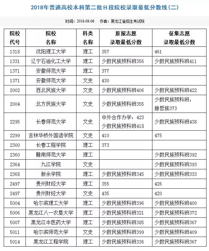 2018年黑龙江省普通高校本科第二批B段院校录取最低分数线(二)