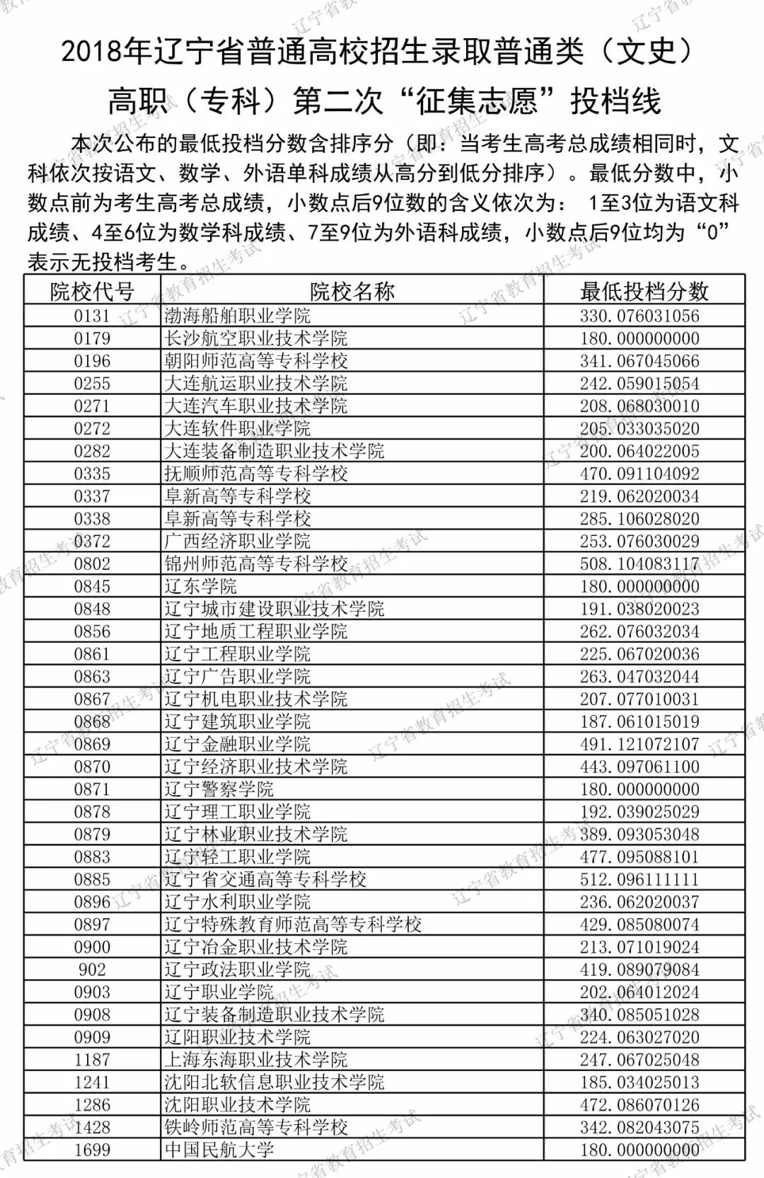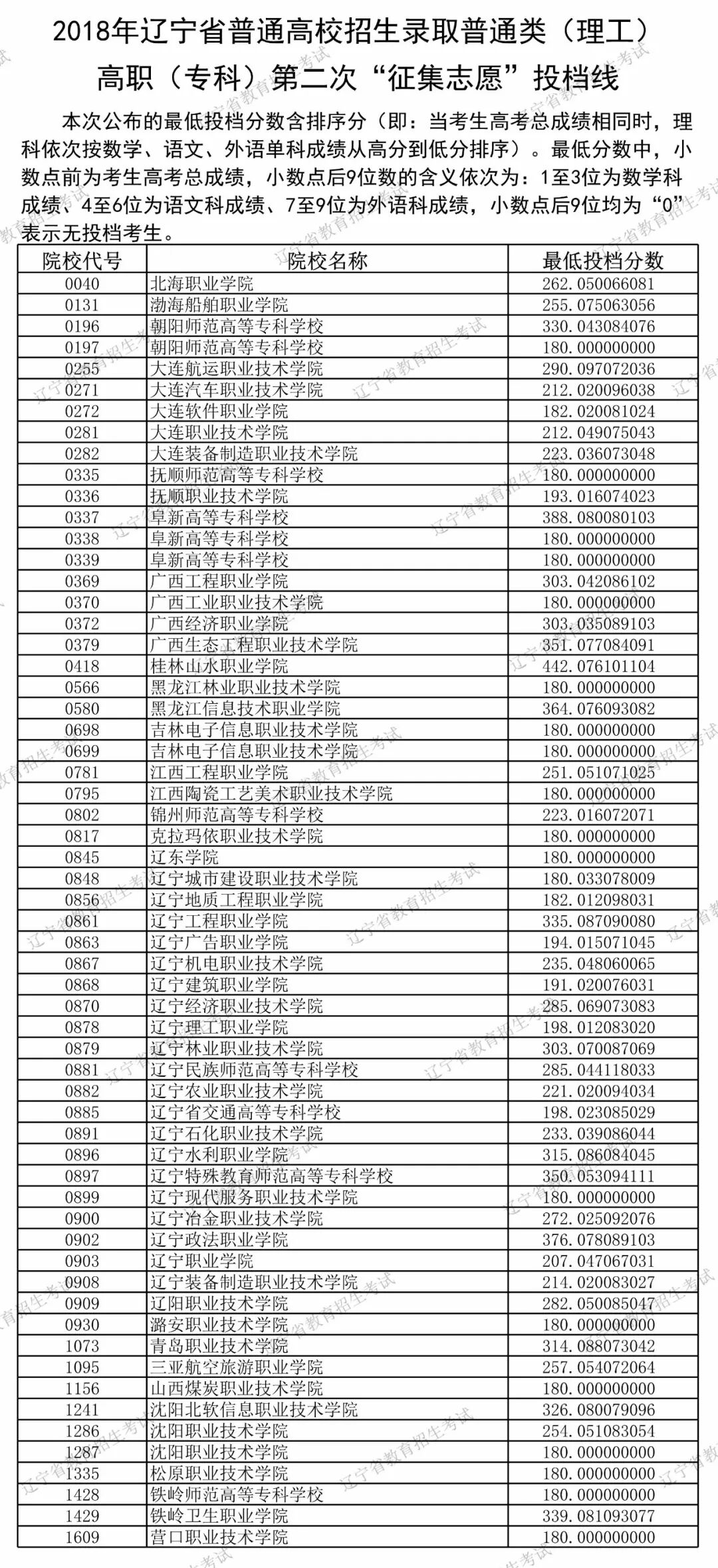 2018年辽宁省普通高校招生录取普通类高职(专科)第二次“征集志愿”投档线