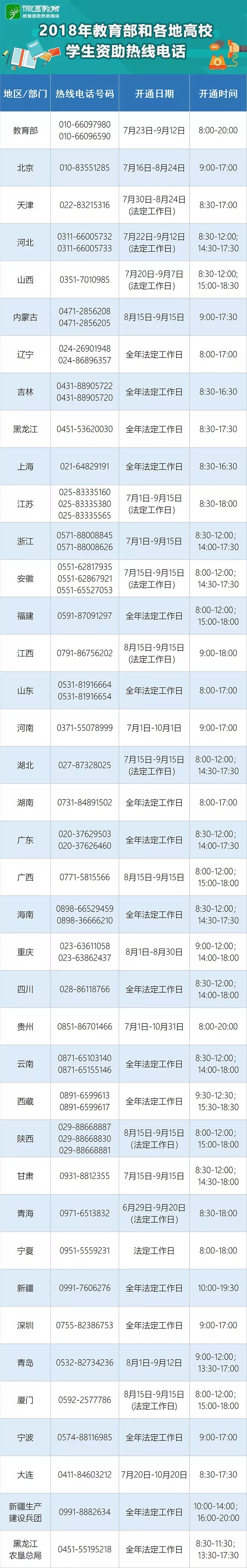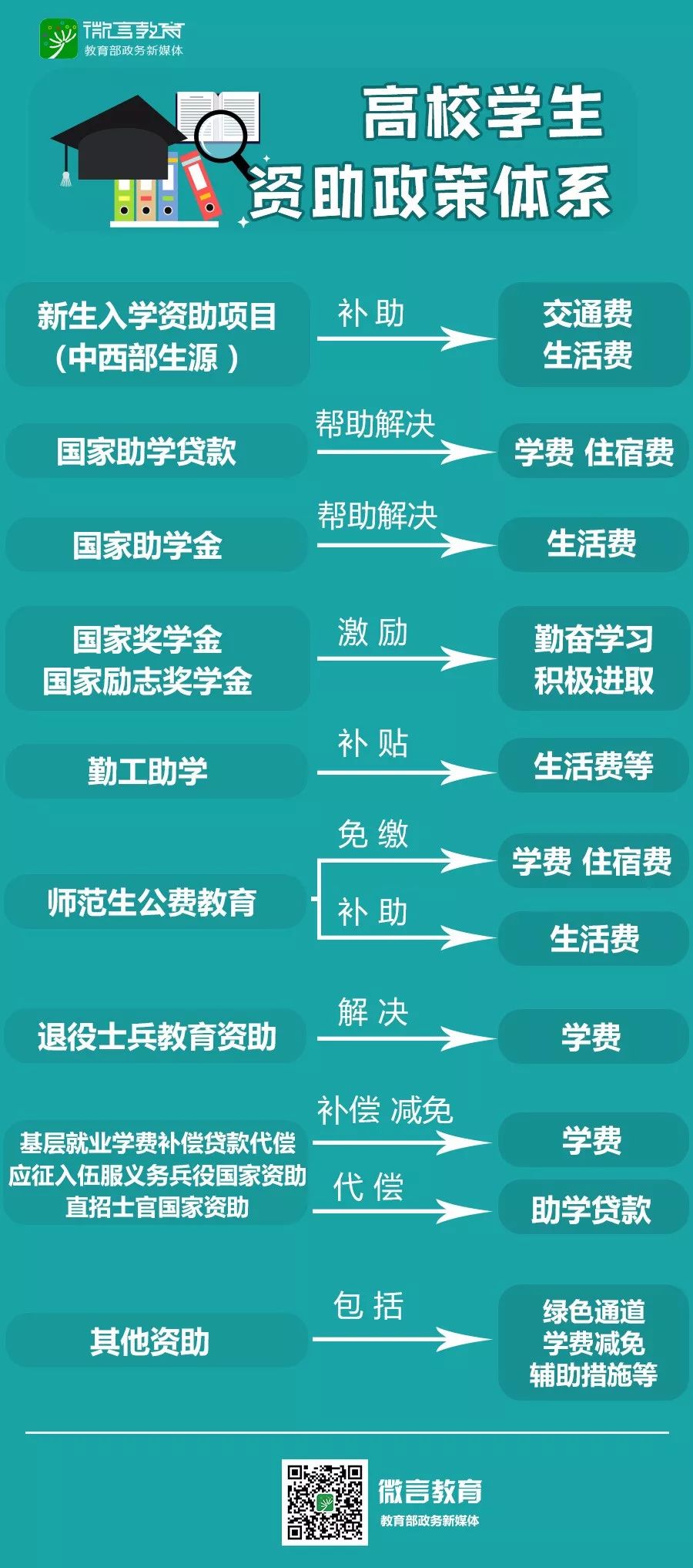 又是一年发榜时,又到一年入学季。贫困家庭的考生别发愁,国家已有一整套完善的政策,确保学生不因家庭困难而失学。目前国家学生资助政策体系实现了“三个全覆盖”:即各个学段全覆盖、公办民办学校全覆盖、家庭经济困难学生全覆盖。 本专科生教育、研究生教育阶段具体有哪些资助政策?2018年教育部和各地高校学生资助热线电话是多少?小编带大家一起看↓↓↓ 1国家奖学金 奖励5万名特别优秀的二年级以上(含二年级)本专科在校生,每生每年8000元。 2国家励志奖学金 奖励资助品学兼优、家庭经济困难的二年级以上(含二年级)本专科在校生,每生每年5000元。 3国家助学金 资助家庭经济困难的本专科在校生,平均资助标准为每生每年3000元。 4国家助学贷款 政府主导、金融机构向高校家庭经济困难学生提供的免担保、免抵押信用贷款,用于解决在校期间的学费和住宿费,每生每年最高不超过8000元。在校学习期间利息全部由财政贴付,毕业后的利息由借款学生负担。 5基层就业国家资助 对中央部属高校应届毕业生,自愿到中西部地区和艰苦边远地区基层单位就业、服务期达到3年以上(含3年)的,补偿学费或代偿国家助学贷款,每生每年不高于8000元。地方高校毕业生学费补偿贷款代偿办法由各地参照中央政策制定执行。 6应征入伍服义务兵役国家资助 对应征入伍服义务兵役的高校学生在校期间缴纳的学费或获得的国家助学贷款,实施一次性补偿或代偿,对退役后复学的高校在校生(含高校新生)减免学费。资助标准每生每年不高于8000元。 7直招士官国家资助 对直接招收为士官的高等学校学生,入伍时对其在校期间缴纳的学费实行一次性补偿或对其获得的国家助学贷款实行代偿,每生每年不高于8000元。 8师范生公费教育 在北京师范大学、华东师范大学、东北师范大学、华中师范大学、陕西师范大学和西南大学六所教育部直属师范大学的公费师范生,免缴在校学习期间学费、住宿费,并补助生活费。地方师范院校师范生资助由各地自行实施。 9退役士兵学费资助 对退役一年以上、考入全日制普通高等学校的自主就业退役士兵,给予学费资助,每生每年不高于8000元。 10新生入学资助项目 对中西部地区高校家庭经济困难新生一次性发放路费及短期生活费补助,省(区、市)内院校录取的每人500元,省(区、市)外院校录取的每人1000元。 11勤工助学 学校设置校内勤工助学岗位,优先向家庭经济困难学生提供。劳动报酬原则上不低于当地政府或有关部门制定的最低工资标准或居民最低生活保障标准。 12校内资助 学校设立校内奖学金、助学金、困难补助、伙食补贴、校内无息借款、减免学费等,利用事业收入资金以及社会团体、企事业单位和个人捐助资金实施校内资助。 13绿色通道 全日制普通高校建立“绿色通道”,对被录取入学、无法缴纳学费和住宿费的家庭经济困难新生,先办理入学手续,然后再根据学生实际情况,分别采取相应方式予以资助。 1国家奖学金 奖励特别优秀的研究生。其中,硕士生3.5万名,每生每年2万元;博士生1万名,每生每年3万元。 2学业奖学金 研究生学业奖学金的覆盖面、等级、奖励标准和评定办法由各高校确定,标准不超过同阶段研究生国家奖学金标准的60%。 3国家助学金 资助全国普通高等学校纳入全国研究生招生计划的所有全日制研究生(有固定工资收入的除外)。硕士生每生每年不低于6000元,中央高校博士生每生每年不低于15000元,地方高校博士生每生每年不低于13000元。 4国家助学贷款 政府主导、金融机构向高校家庭经济困难学生提供的免担保、免抵押信用贷款,用于解决在校期间的学费和住宿费,每生每年最高不超过12000元。在校学习期间利息全部由财政贴付,毕业后的利息由借款学生负担。 5“三助”岗位津贴 高等学校设置研究生“三助”(助研、助教、助管)岗位,并提供“三助”津贴。 研究生国家助学贷款、基层就业国家资助、服义务兵役国家资助、直招士官国家资助、退役士兵学费资助,申请条件、程序等有关规定,与本专科生基本相同,资助标准为每生每年不高于12000元。 资助热线 上学时如遇到经济困难需要帮助,请及时联系录取院校的学生资助部门或拨打各地高校学生资助热线。切勿轻易泄露个人相关信息,谨防电话、网络等各类诈骗。 2018年教育部和各地高校学生资助热线电话,戳图查看↓↓↓