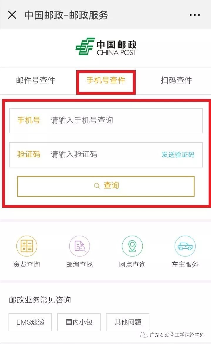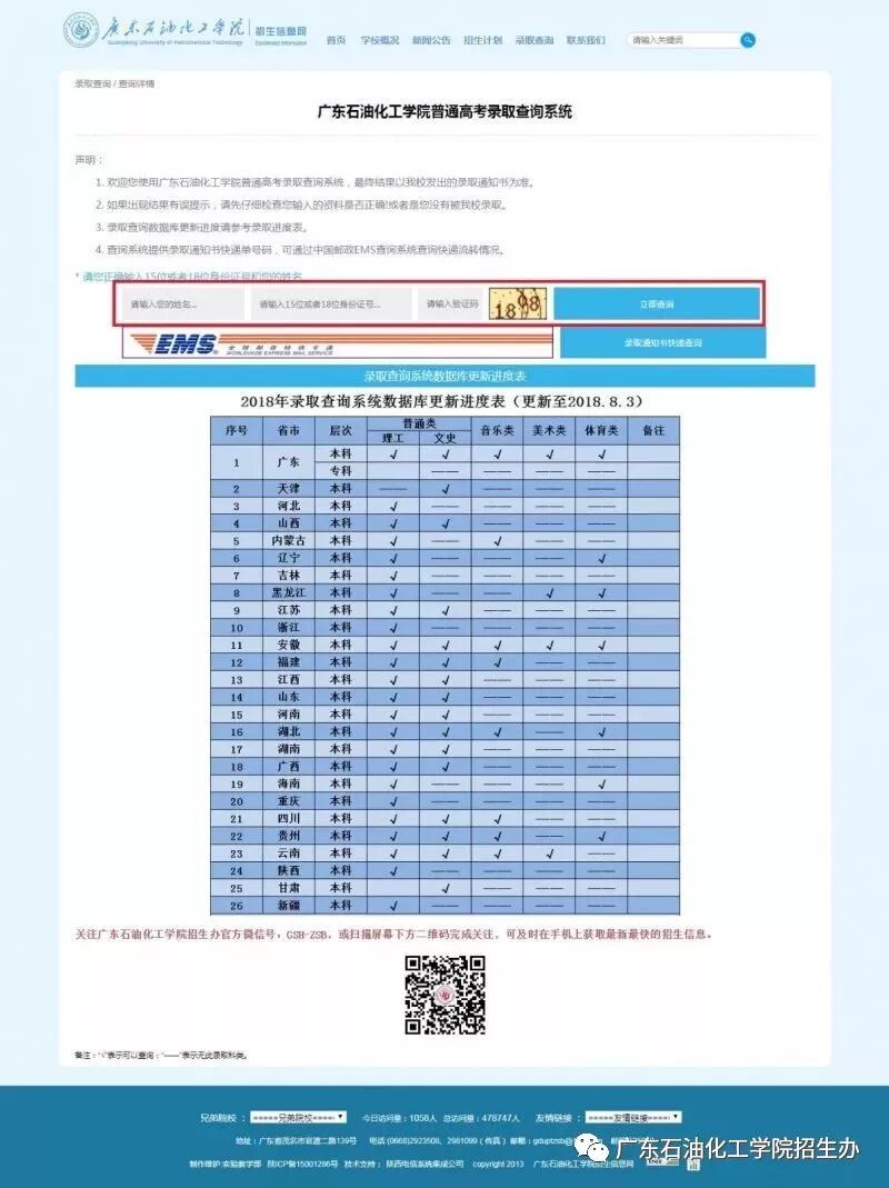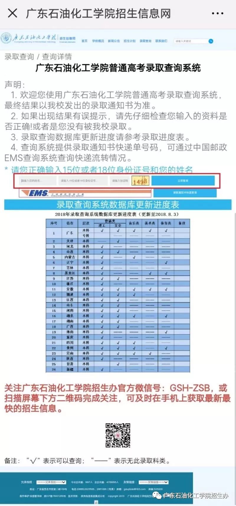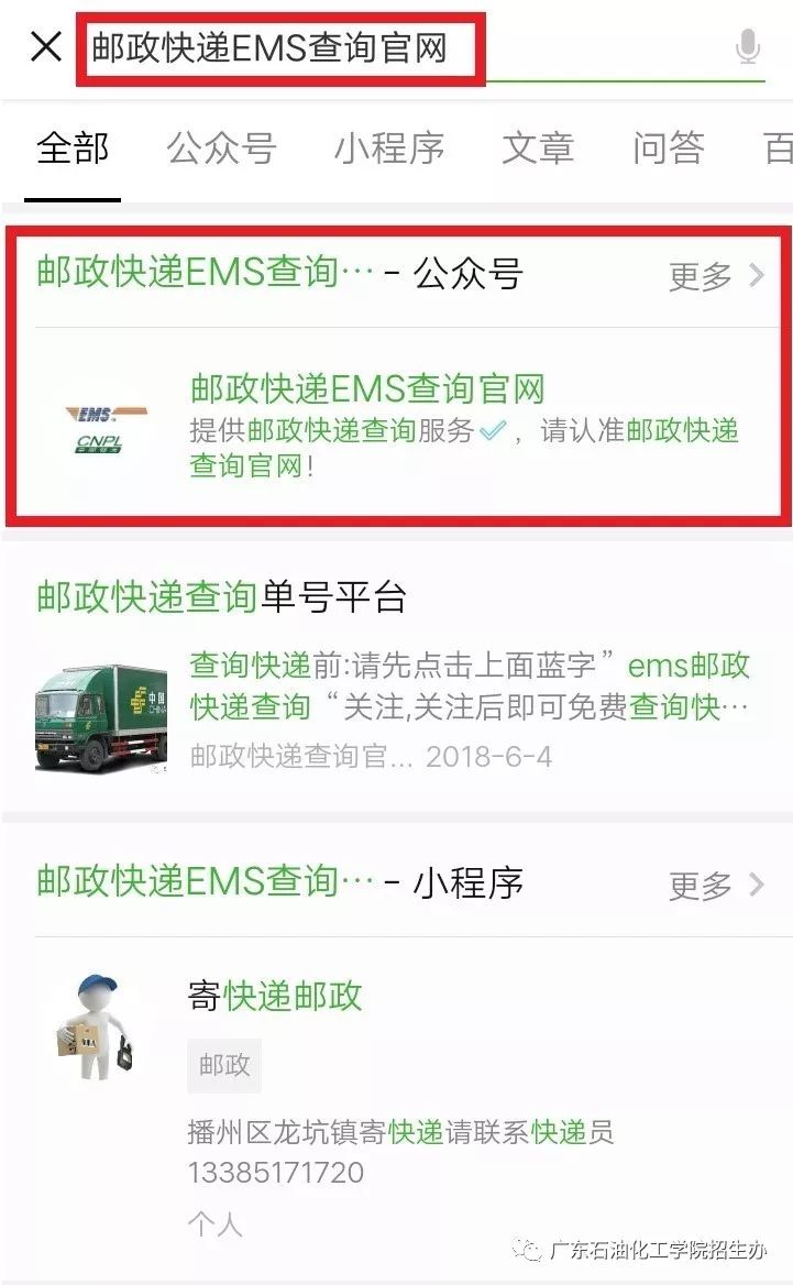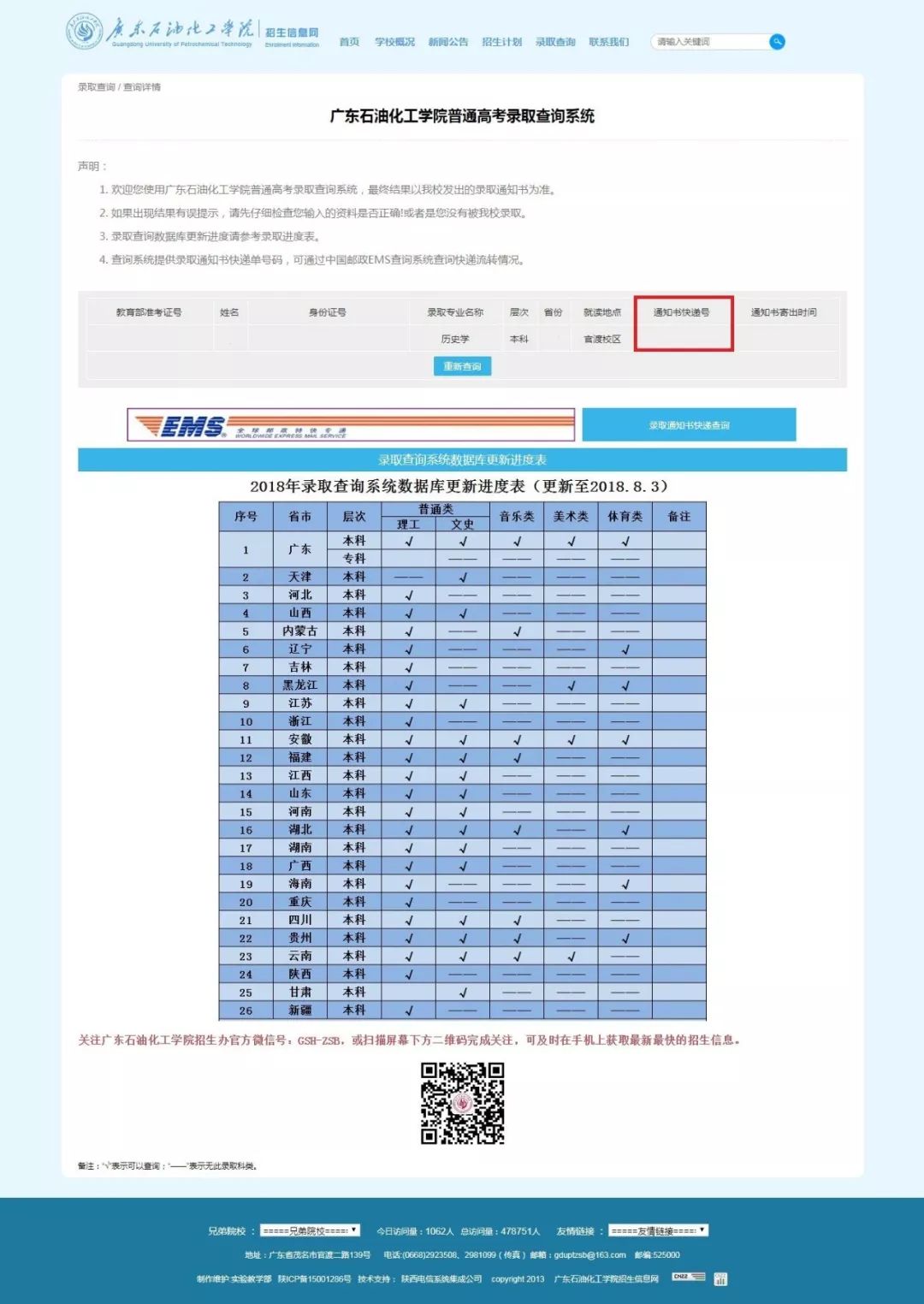 2018年8月7日,我校广东省本科批次、专科批次和省外本科批次的录取通知书、新生入学资料已全部封装完毕,共计5193件EMS信件并移交给中国邮政,省内预计3天可以送达,省外预计5天送达。 在此期间,请各位考生和家长保持联系电话的畅通,注意EMS快递的查收信息。也提醒广大考生和家长,要根据我校提供的通知书样式公示(点击此处可查看公示:广东石油化工学院2018年新生录取通知书闪亮登场),认真核对通知书的真伪,以防上当受骗。如有疑问,请拨打我校招生办的办公电话:0668-2923508进行咨询。 各位考生和家长可关注我校招生办的官方微信公众号,查询录取通知书快递单号。 1关注微信公众号:广东石油化工学院招生办, 微信号:(GSH-ZSB) 2,先点击查询服务,再点击录取查询 3,进入查询系统后 输入“个人姓名”和“身份证号码” 输入验证码,点击“立即查询” 快递单号就出来啦! (注意:身份证号码中”X“为大写英文字母) 1 输入我校招生信息网网址: http://zs.gdupt.edu.cn/ 进入我校信息网 然后点击录取查询 2、进入查询系统后 输入“个人姓名”和“身份证号码” 输入验证码 点击“立即查询” 录取结果就出来啦! (注意:身份证号码中”X“为大写英文字母) 1打开微信搜索引擎搜索:邮政快递EMS查询官网 找到相关公众号并添加关注 2、点击邮政快递查询 3、使用邮件号查件 先输入“邮件号”再点击查询 或点击手机号查件 先输入“手机号码”再点击查询 感谢广大考生和家长对我校高考招生录取工作的密切关注。如有疑问,请拨打我校招生办的办公电话:0668-2923508。