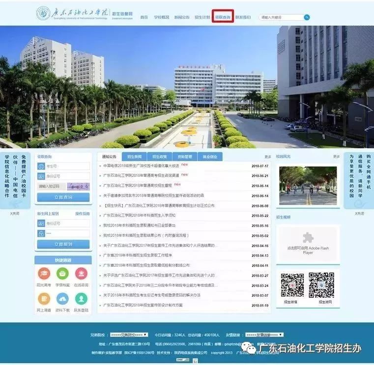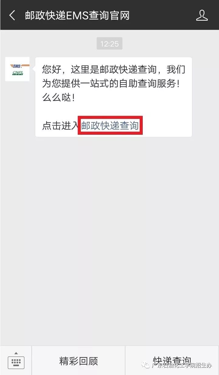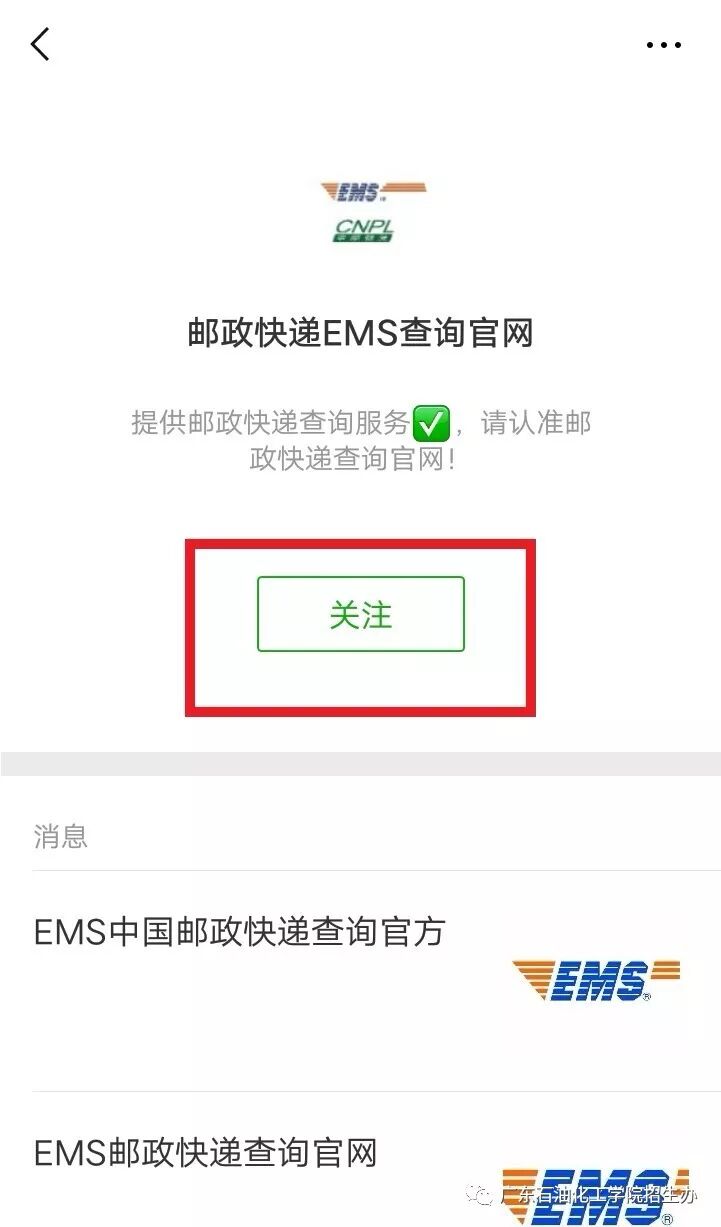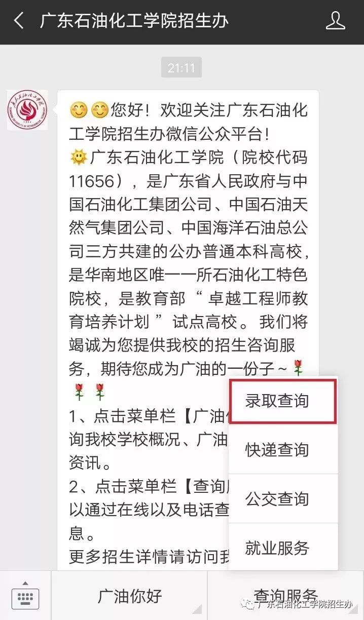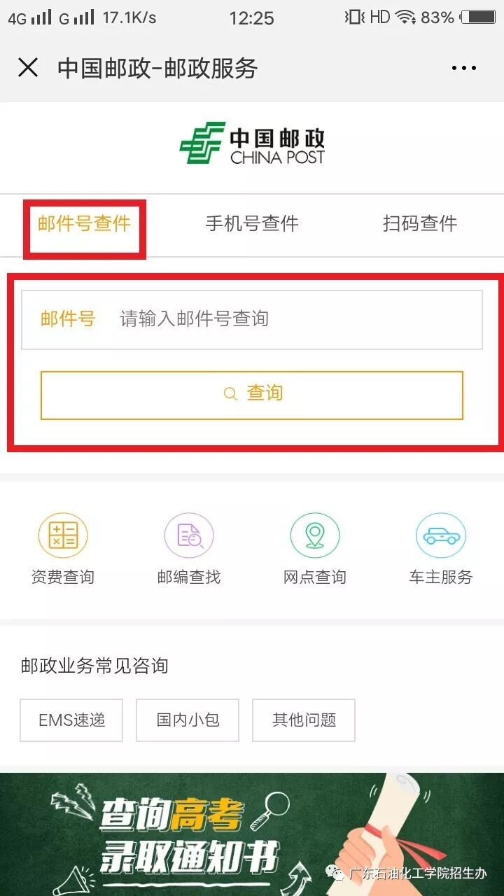 2018年8月7日,我校广东省本科批次、专科批次和省外本科批次的录取通知书、新生入学资料已全部封装完毕,共计5193件EMS信件并移交给中国邮政,省内预计3天可以送达,省外预计5天送达。 在此期间,请各位考生和家长保持联系电话的畅通,注意EMS快递的查收信息。也提醒广大考生和家长,要根据我校提供的通知书样式公示(点击此处可查看公示:广东石油化工学院2018年新生录取通知书闪亮登场),认真核对通知书的真伪,以防上当受骗。如有疑问,请拨打我校招生办的办公电话:0668-2923508进行咨询。 各位考生和家长可关注我校招生办的官方微信公众号,查询录取通知书快递单号。 1关注微信公众号:广东石油化工学院招生办, 微信号:(GSH-ZSB) 2,先点击查询服务,再点击录取查询 3,进入查询系统后 输入“个人姓名”和“身份证号码” 输入验证码,点击“立即查询” 快递单号就出来啦! (注意:身份证号码中”X“为大写英文字母) 1 输入我校招生信息网网址: http://zs.gdupt.edu.cn/ 进入我校信息网 然后点击录取查询 2、进入查询系统后 输入“个人姓名”和“身份证号码” 输入验证码 点击“立即查询” 录取结果就出来啦! (注意:身份证号码中”X“为大写英文字母) 1打开微信搜索引擎搜索:邮政快递EMS查询官网 找到相关公众号并添加关注 2、点击邮政快递查询 3、使用邮件号查件 先输入“邮件号”再点击查询 或点击手机号查件 先输入“手机号码”再点击查询 感谢广大考生和家长对我校高考招生录取工作的密切关注。如有疑问,请拨打我校招生办的办公电话:0668-2923508。