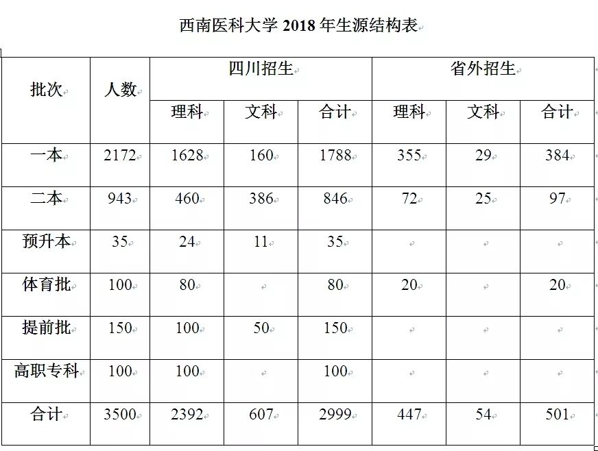 一本招生从点到面均有较大提升。今年新增儿科学一本招生,全校一本招生专业达到14个。一本专业招生布点省份从2017年的9个扩大到20个。 生源质量继续保持进口旺的良好势头。在川招生一本理科调档线名列川内高校第六名,省属院校第一名。一本文科调档线名列省内高校第九名,省属院校第三名。二本理科调档线名列省内高校第六名,二本文科调档线名列省内高校第十名。在一本专业招生的20个省份中,调档线超省控线40分以上的省份达到15个,其中超过70分的省份达到10个,超过省控线100分的省份达到3个。在二本专业招生的13省份中,调档线超省控线40分以上的省份达到11个,其中超过省控线70分的省份达到7个,超过省控线100分的省份达到4个。职教高职民族定向专科三个类别招生调档线分别超省控线124分、159分、179分。 在今年的招生录取工作中,在学校党政领导的高度重视下,招生办公室以巩固生源质量为主旨,在各院系及相关部门大力支持下,招生录取工作严格贯彻执行教育部招生政策和相关规定,进一步加强招生工作规范管理,细化方案,严格程序,规范操作,严格把关,确保录取公平公正;严格执行“30个不得”招生工作禁令;切实加强招生录取信息公开和监管,实行录取信息专人负责,确保新生录取信息安全,严防信息数据泄露。 在今年招生录取期间,招生办公室强化服务意识,对每一位考生及家长做到精细贴心服务,做到了录取信息及时公开,自觉接受考生和社会监督;成立招生咨询室,开通招生咨询热线,专门答复考生疑问,将学校良好的精神面貌第一时间展现给考生及家长。招生办公室通过招生信息网和学校微信及时对外发布我校各省、各批次提档分数线,网站访问量达2万余次,微信阅读量达5万余次。同时招生办公室还通过网站考生答疑板块对考生咨询问题进行答疑。 目前,我校2018年录取新生信息已经全部可以通过西南医科大学招生信息网(http://zsxxw.swmu.edu.cn)录取查询系统进行查询。