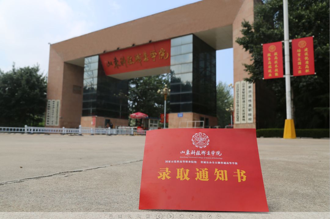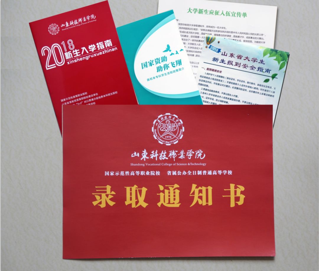 山东科技职业学院录取通知书设计简洁大方,以中国红为背景,代表着喜庆、热闹与祥和,寓意祝贺同学们被我院录取,欢迎进入我院学习深造。 封面含校徽、中英文校名及说明办学层次和性质的内容——国家示范性高等职业院校、省属公办全日制普通高等学校。背面注明录取人姓名、录取专业、学制以及编号。通知书突出了“厚德博学,笃志拓新”之校训,我院通过坚持“质量立校、人才强校、特色兴校、依法治校”发展战略,涵养“经天纬地,追求卓越”核心文化,形成了“产学研一体、职场化育人、国际化办学、现代化治理”的鲜明特色。