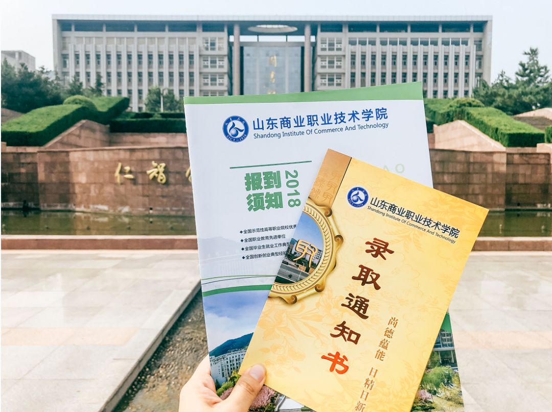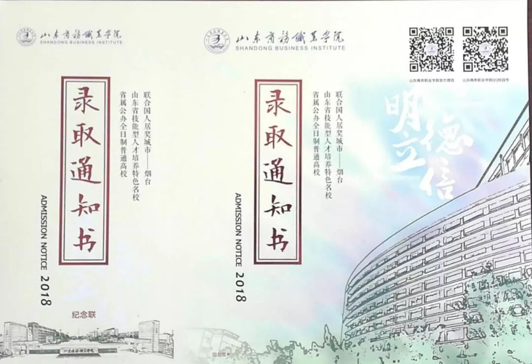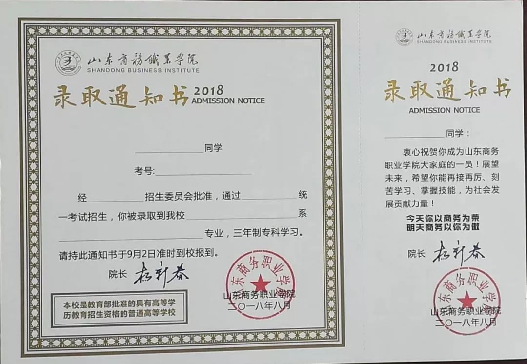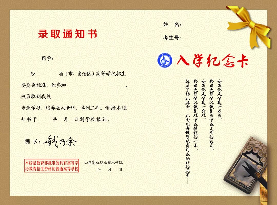 山东商业职业技术学院录取通知书主色调为黄色,配以花卉底纹,典雅大方,取义锦上添花。正面中心为圆形镜子形状,配以学校全景照片,意指天圆地方,一镜知山商。录取通知书正面上方是校徽校名,“录取通知书”为五个红色烫金大字,十分醒目。“录取通知书”旁边是学校的校训——尚德蕴能,日精日新。尚德,即崇尚德性与品格的培养;蕴能,即发掘能力培养功力,突出职业教育“能力主线”的教育理念。日精日新,语出古训,意谓着求精求新,以精益求精的精神积极探索,务实创新更上一层楼,培养职教“工匠”。 通知书内页,左面上方印有醒目的“录取通知书”字样,下方是录取通知等内容;右面为“入学纪念卡”,书写着学校对同学们深深的祝福和期许,报到结束后,该纪念卡将留作同学们永久纪念。 随录取通知书寄出的还有《报到须知》,对在入学报到过程中需要注意的生活、学习等内容进行暖心提醒;在须知中,还附有院长钱乃余教授致2018级新生的一封信,师长的谆谆教诲,期待每一位同学拥有丰富充实的大学生活。