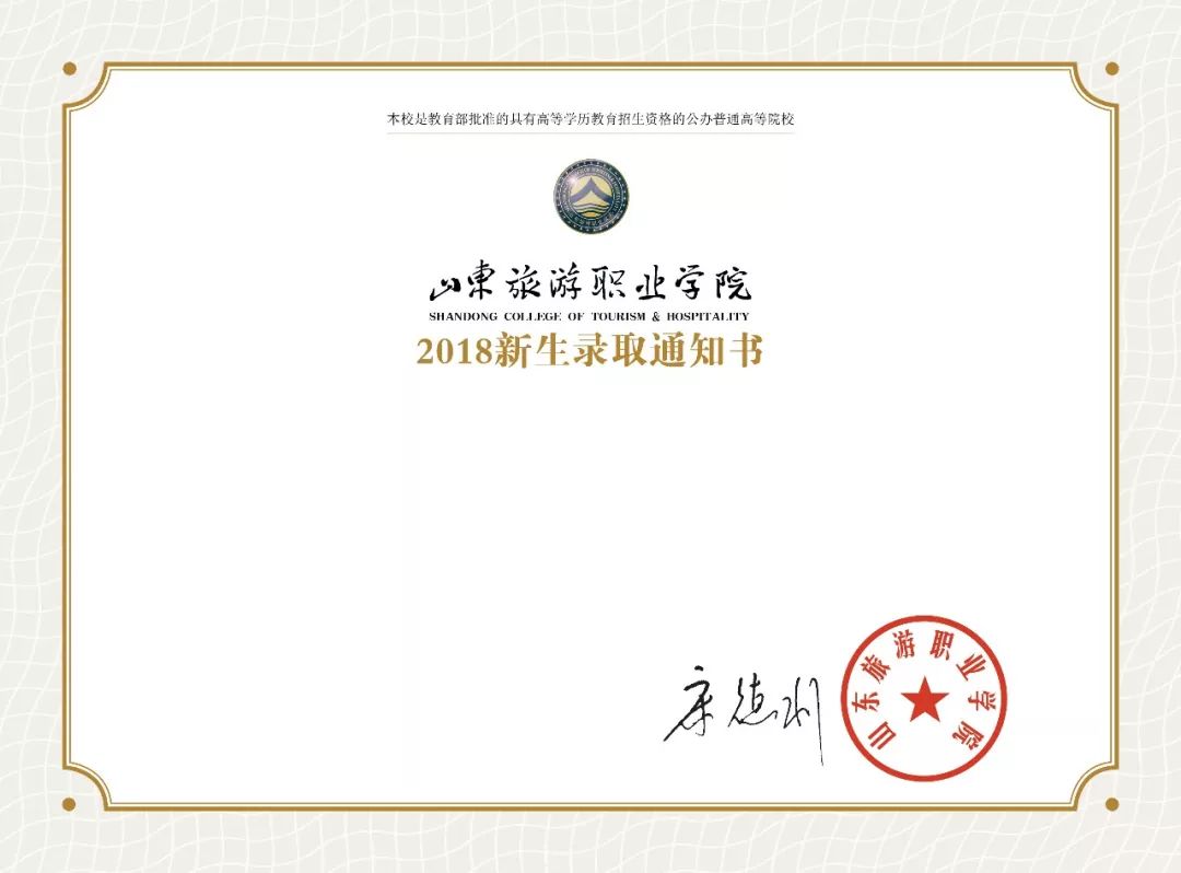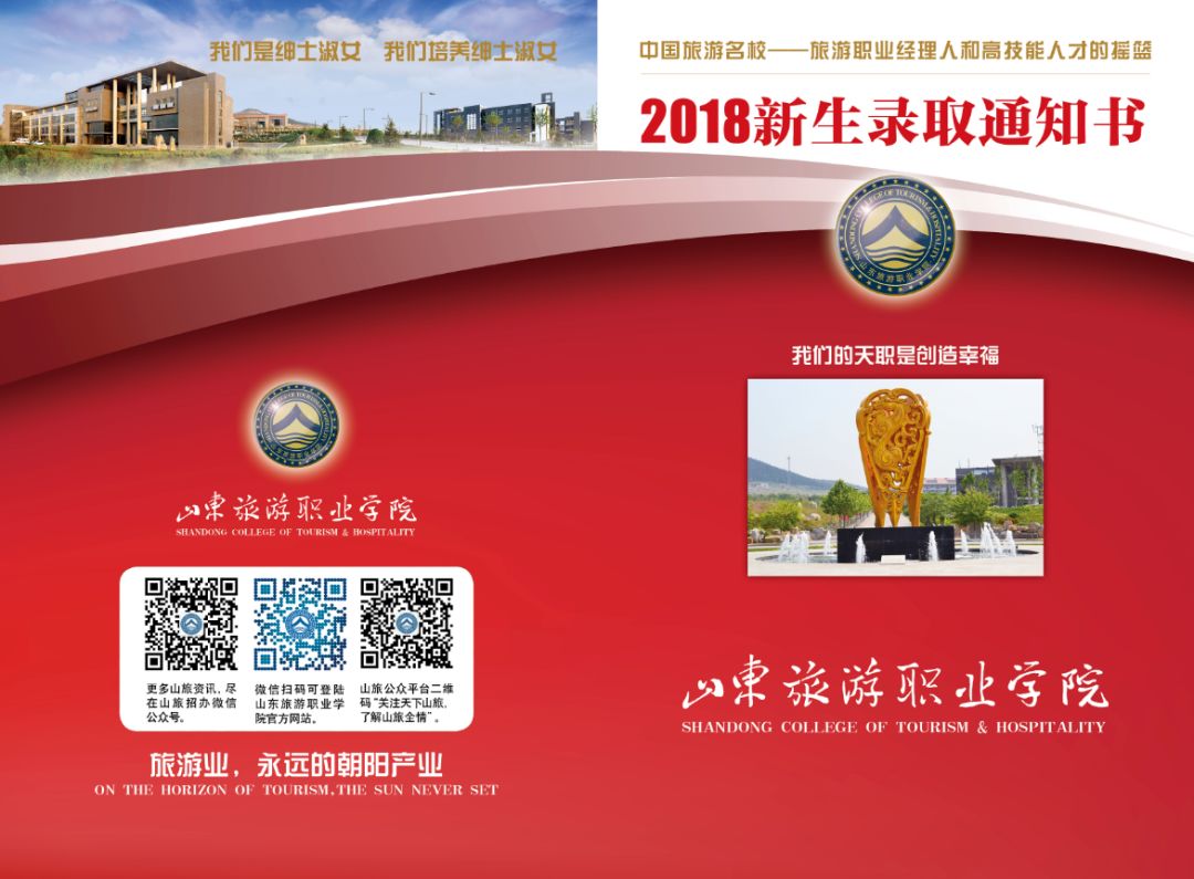 山东旅游职业学院录取通知书设计简洁大方,主色采用传统的中国红,寓意吉祥喜庆。封面有学院定位、学院剪影、校徽、校训和中英文形式的校名等内容。中心位置为学院标志性建筑“天行健”,饱含了母校对山旅学子们的殷切期望,希望每一位学生都能够自强不息,追求卓越。通知书的内芯上除了有学院公章,还有宋德利院长的亲笔签名哦!收到通知书的山旅2018级小朋友们,一定要好好保存呦!