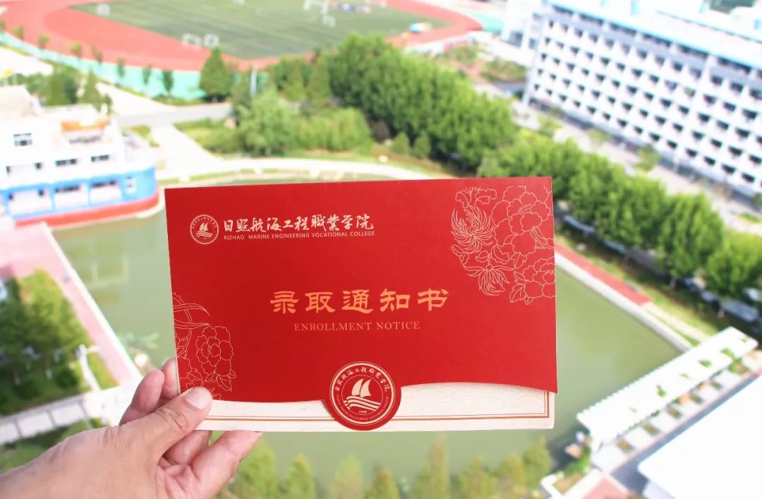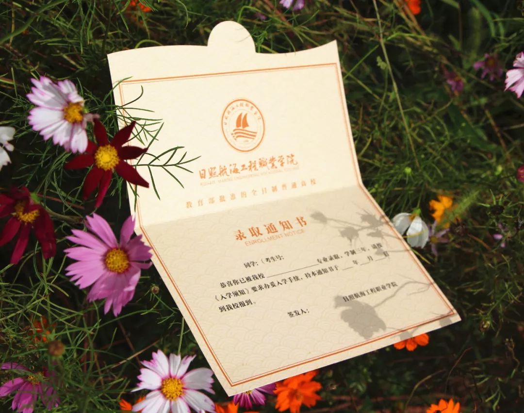 日照航海工程职业学院的录取通知书封面以正红色为底色,彰显庄重与正式。牡丹花以描线的形式绘制在封面上,校徽中船帆恰于海中航行,祝愿学子们能够在航院获取知识的芬芳,开启一段美好的航海之旅。里页黄色波纹如云如海,彰显学院的乘风破浪、直挂云帆的航海特色文化底蕴。背面使用了夺目的金色字体,校训“海纳百川