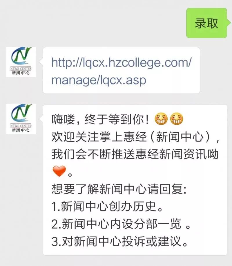 方法一 第一步:关注“掌上惠经” 第二步:进入掌上惠经点击二级菜单 点击录取查询 方法二 第一步:关注“掌上惠经” 第二步:后台回复 录取 / 录取查询 即可进入查询入口