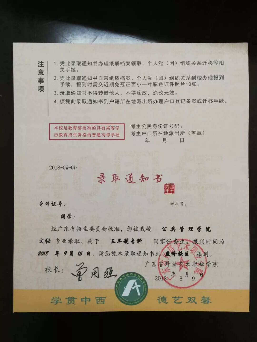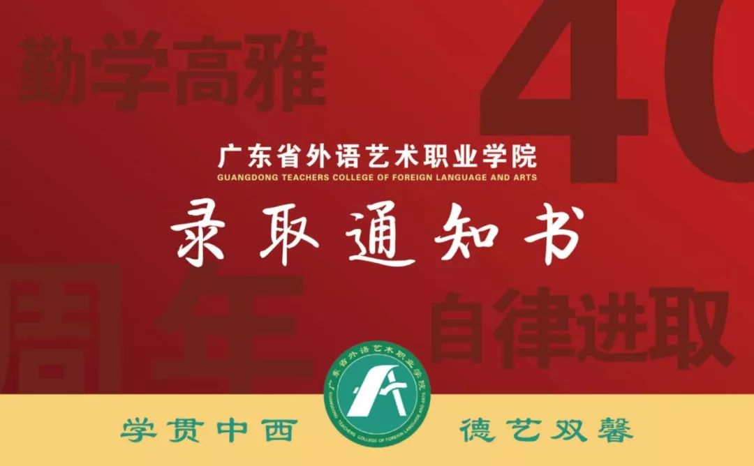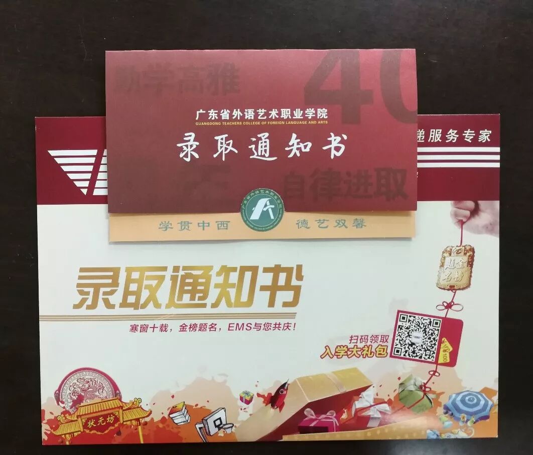 广东省外语艺术职业学院2018级新生录取通知书 九月 - 开学季 那些挑灯夜读的日子,那些嬉笑打闹一起走过的时光,都成了你心底最大的慰藉。恭喜你坚持努力地走过了那些年,即将成为广外艺校园的新成员。 接下来,请你以饱满的热情,十足的自信来面对人生新的一段旅程,昂起胸膛,面带微笑,大步流星地往前走。 2018级的萌新们,你们的录取通知书即将送达! 被认真封装好的录取通知书 经过广东省外语艺术职业学院招生办公室的老师及同学们的努力,2018级新生第二批录取通知书,已在2018年8月10日通过中国邮政特快邮件途径,将邮寄到每一位外艺新生的手中。 本次寄出的录取通知书,包含:3+证书230份,五年一贯制公费定向90份,普通高考美术类390份,普通高考音乐类280份,普通高考文科1102份,共2092份。请各位考生查阅! 此外,我校在河南、湖南、海南、山东和江西五省共招生的50人,录取通知书将在八月中下旬寄出,请大家留意。 广外艺录取通知书邮件中包含 1:40周年校庆版录取通知书 2:2018级新生入学指南 3:高校本专科学生资助政策简介 4:全国学生资助管理中心致新生一封信 5:大学新生应征入伍宣传单 6:我校与中国农业银行合作定制的银行卡 7:新生安全温馨提示