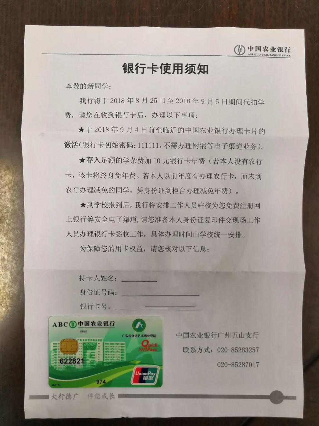 另,收到邮件后,部分同学因特殊原因无法预办理银行卡导致未收到银行卡的,可在开学后携有效证件到我校指定银行网点办理银行卡即可。