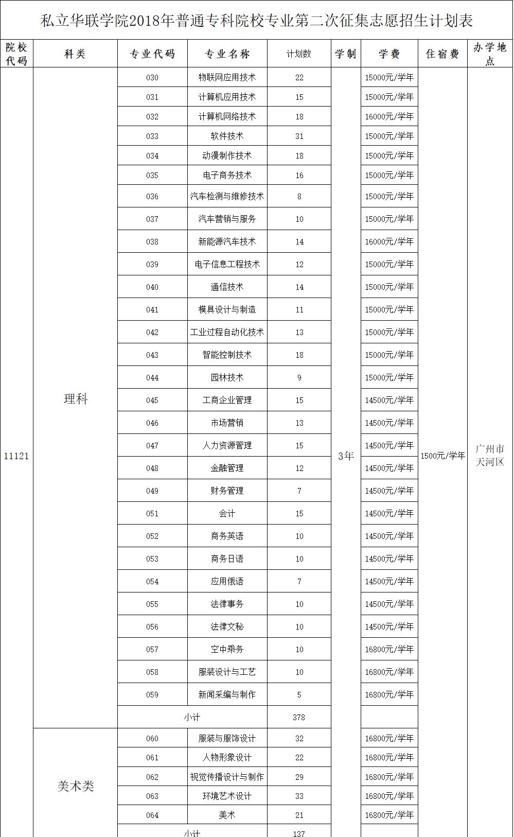 私立华联学院2018年普通专科院校专业