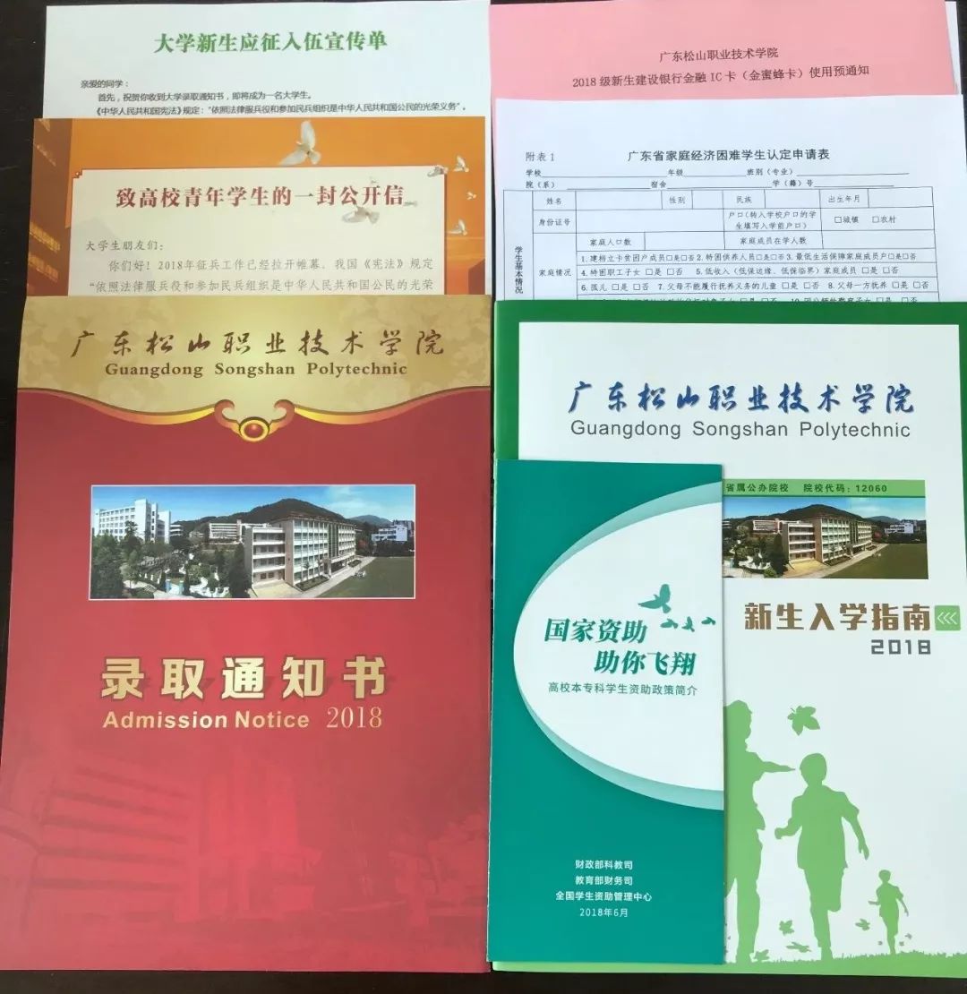 普高及其余类型的考生将会收到:①录取通知书、②入学指南、③致高校青年学生的一封信、④大学生应征入伍优惠政策、⑤高校本专科学生资助政策简介、⑥广东省家庭经济困难学生认定表、⑦2018级新生建设银行金融IC卡(金蜜蜂卡)使用预通知。