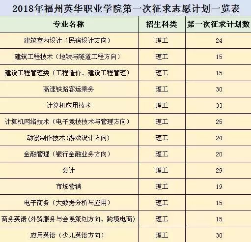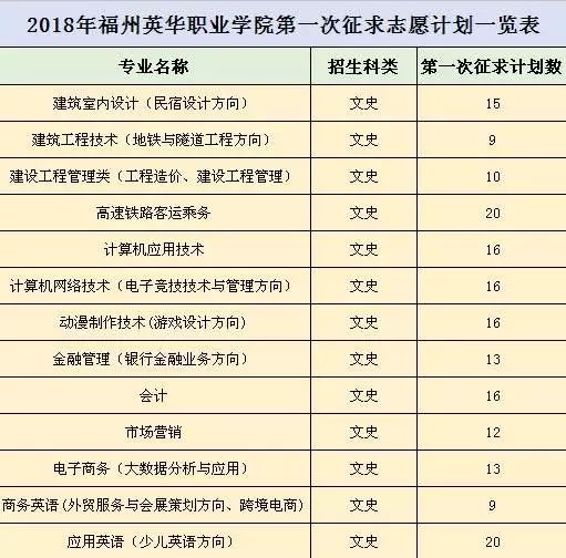 2018年福州英华职业学院 第一次征求志愿招生计划 文史类