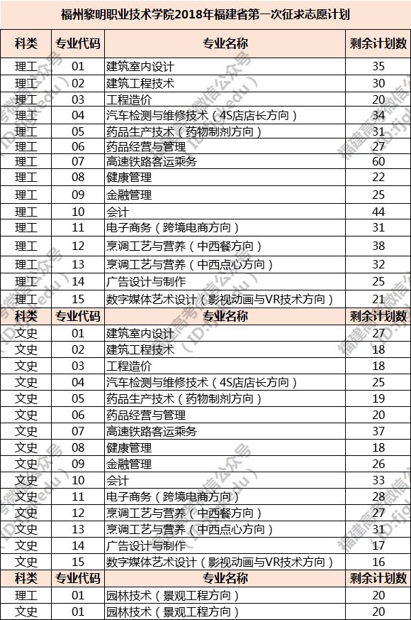 福州黎明职业技术学院2018年福建省第一次征求志愿计划