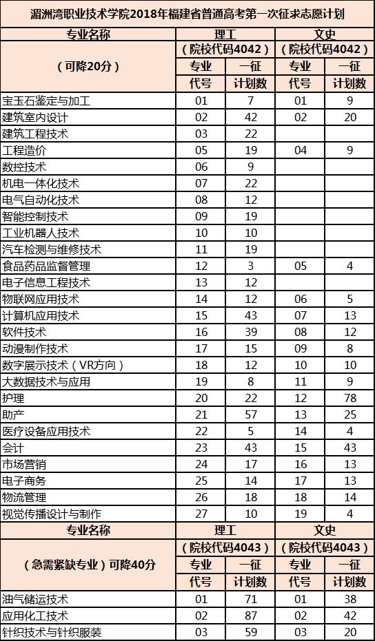 湄洲湾职业技术学院2018年福建省普通高考第一次征求志愿计划
