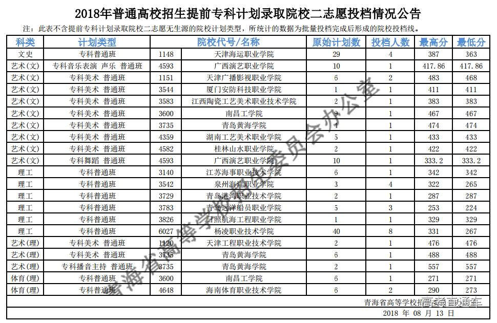 2018年青海省普通高校招生提前专科计划录取院校二志愿投档情况公告