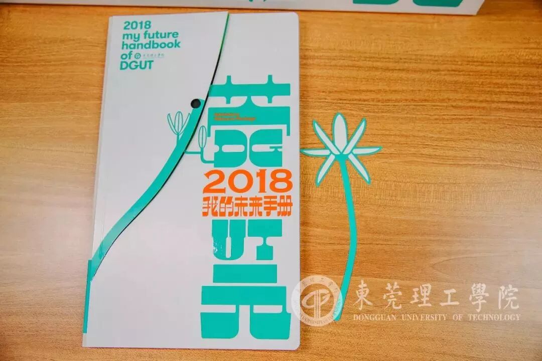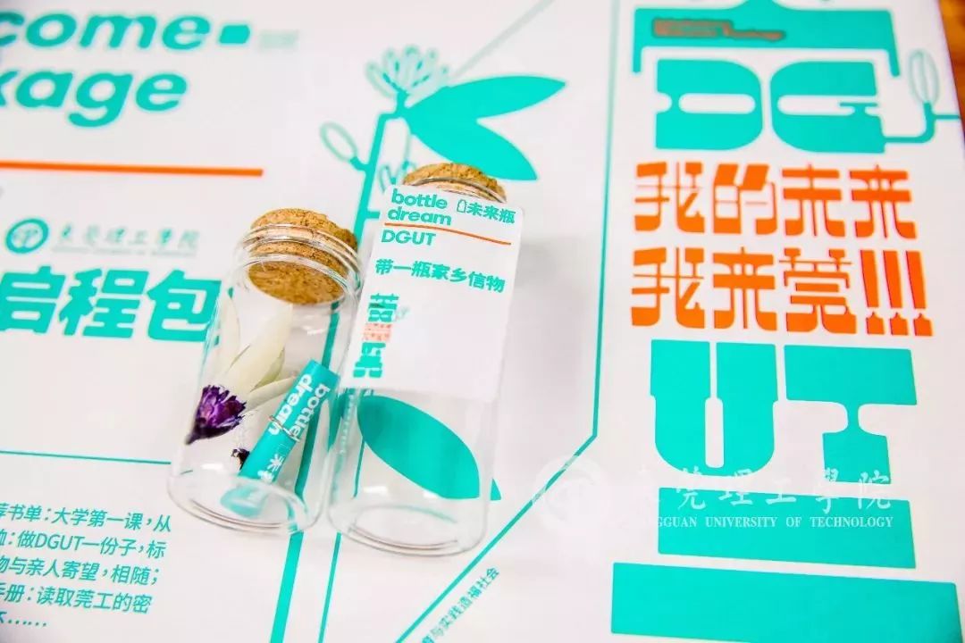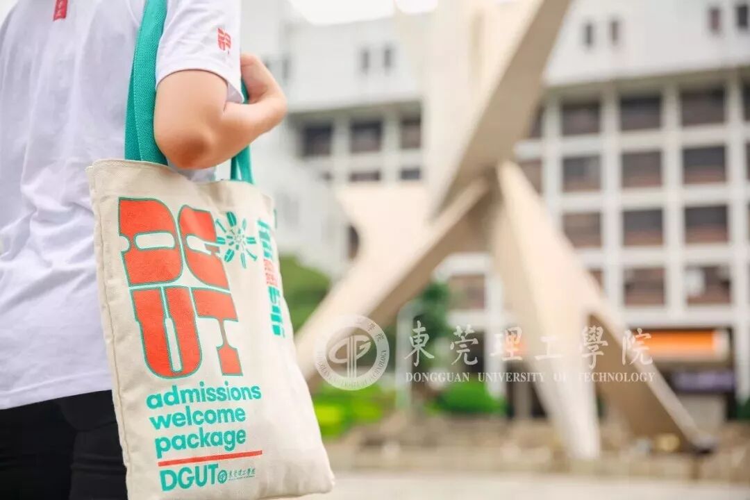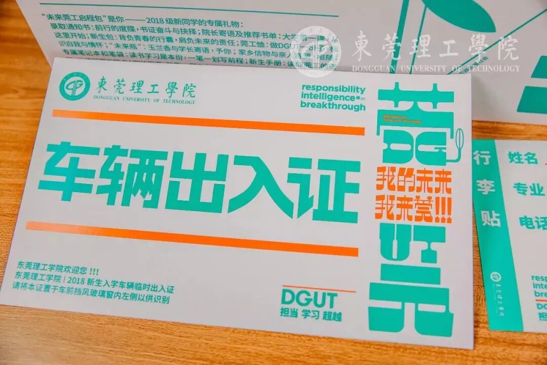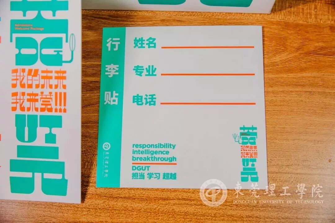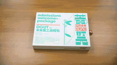 今年东莞理工学院的启程包选择了抽拉式硬盒设计,内附录取通知书、帆布袋、笔袋、莞工T恤、莞工笔记本、“未来瓶”、报到手册、地图册、莞工元素贴纸、行李贴纸、车辆出入证等。
