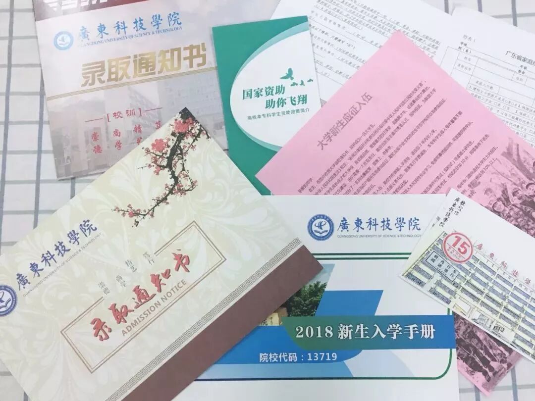 广东科技学院今年的录取通知书相比去年,设计简洁、精致、淡雅。随通知书一并寄出的,还有新生入学手册、助学贷款办理指南、高等学校学生及家庭情况调查表等。